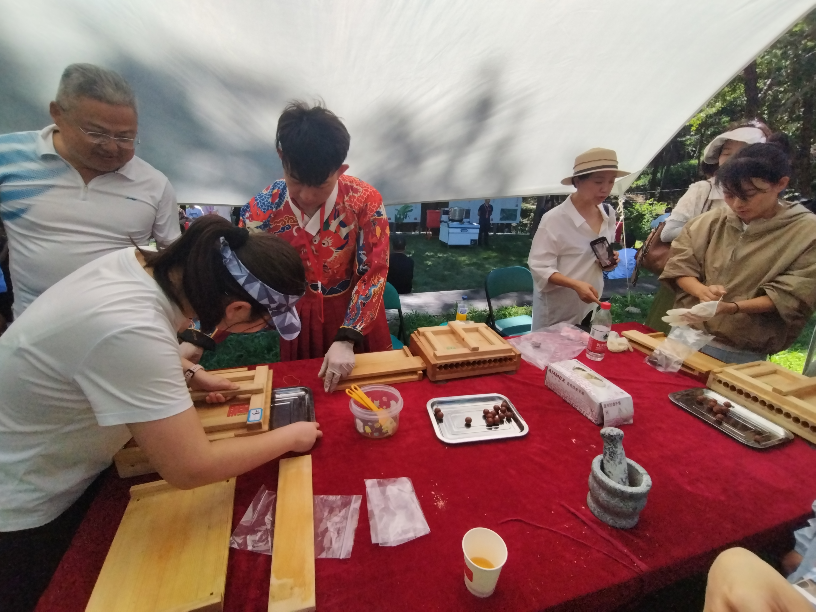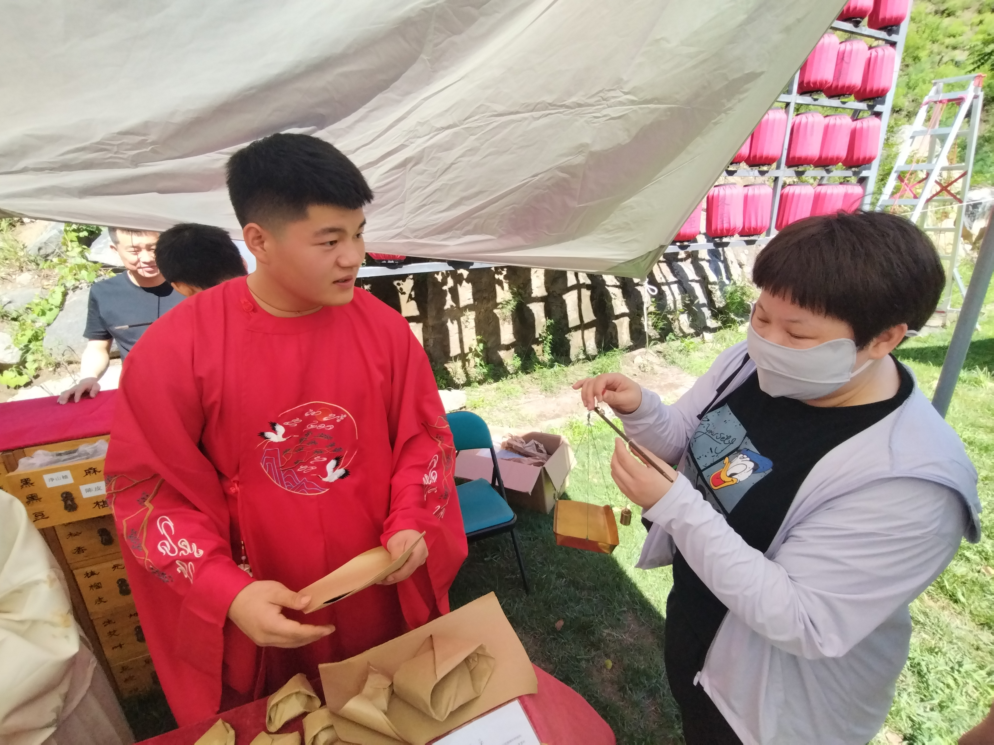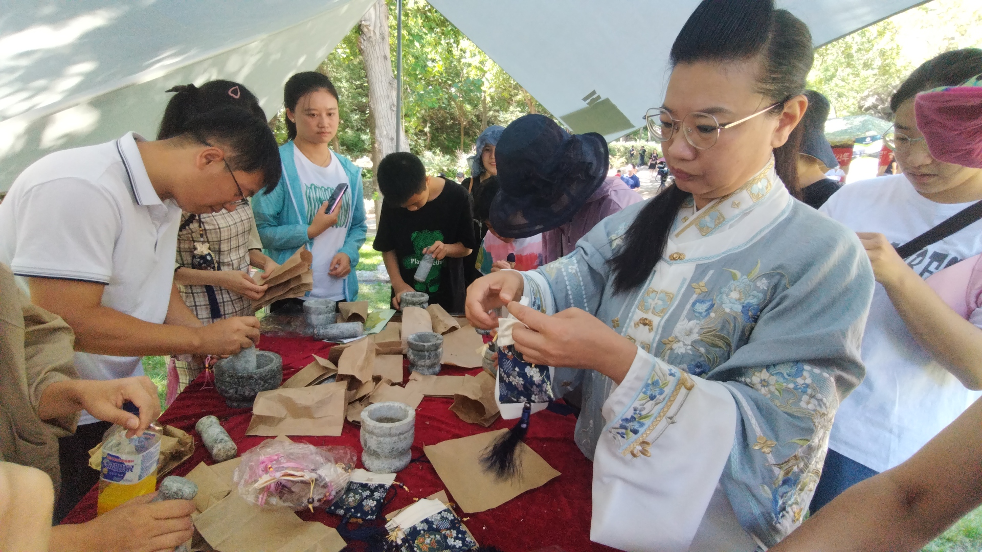 在黃精展區,新鮮採挖的黃精植株與各種黃精製成品按區拜訪,現場工作人員身着漢服,向過往遊客介紹黃精功效。另一邊的製作香囊展台人聲嘈雜,在此起彼伏的「咚咚咚」鑿藥聲中,在工作人員指引下,一個個精美的驅蚊香囊被製作出來。