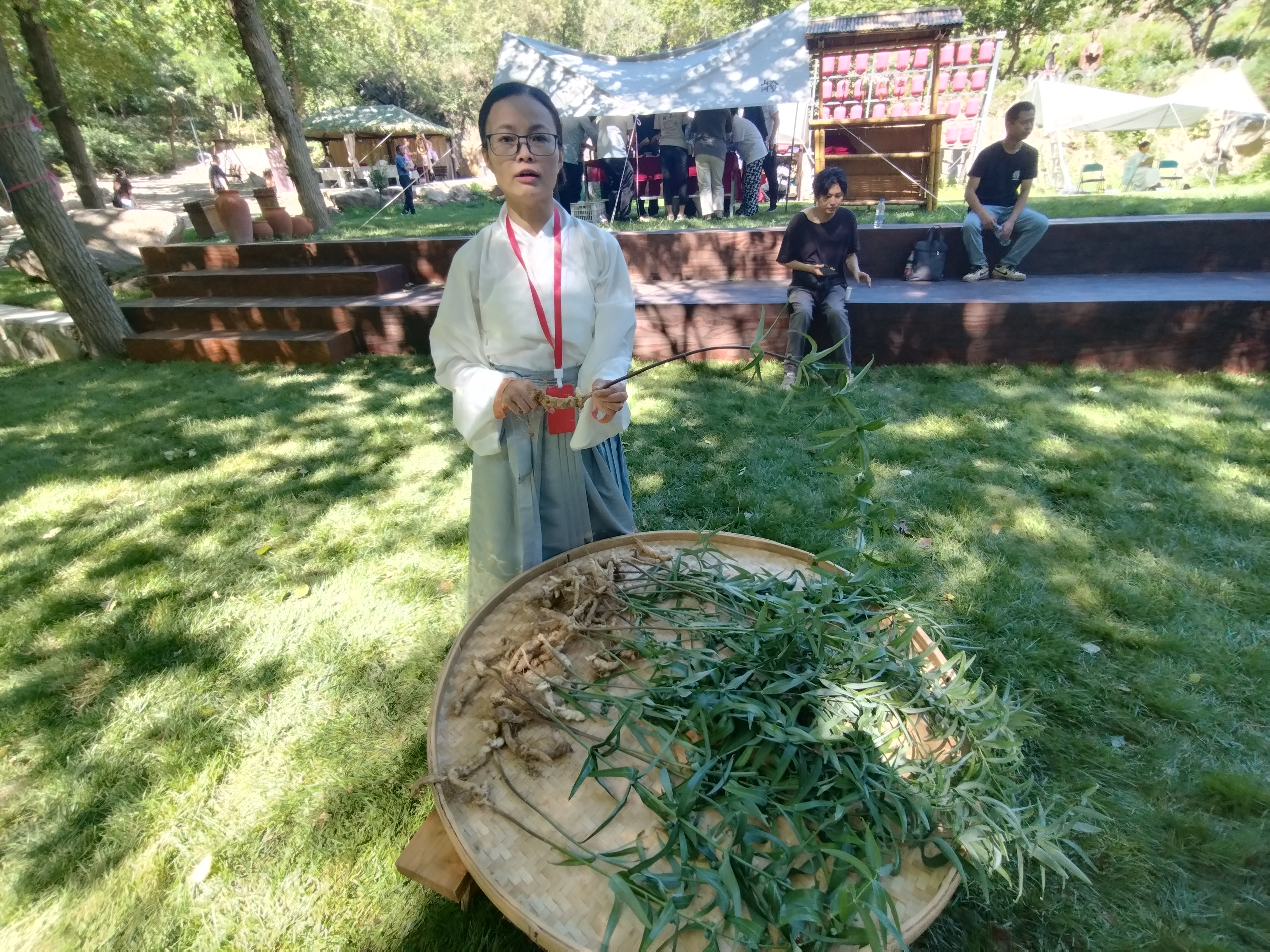 走進十三陵附近的藥王谷,在悠揚的古箏聲中拾級而上,一個個中醫藥展台錯落擺設在路邊林間,遊客們圍聚在各個展台處沉浸感受中醫藥文化。「這是黃精,肉質根莖可粘糖生食,脆嫩甘甜,還做藥膳。我手裏這顆就是昨天才從藥王谷挖來的,老百姓也稱它『雞頭參』,道教經典《抱朴子》內篇將黃精列為仙藥篇,又因黃精可嚼食飽腹,所以後世醫家陶弘景稱之為『仙人餘糧』。」