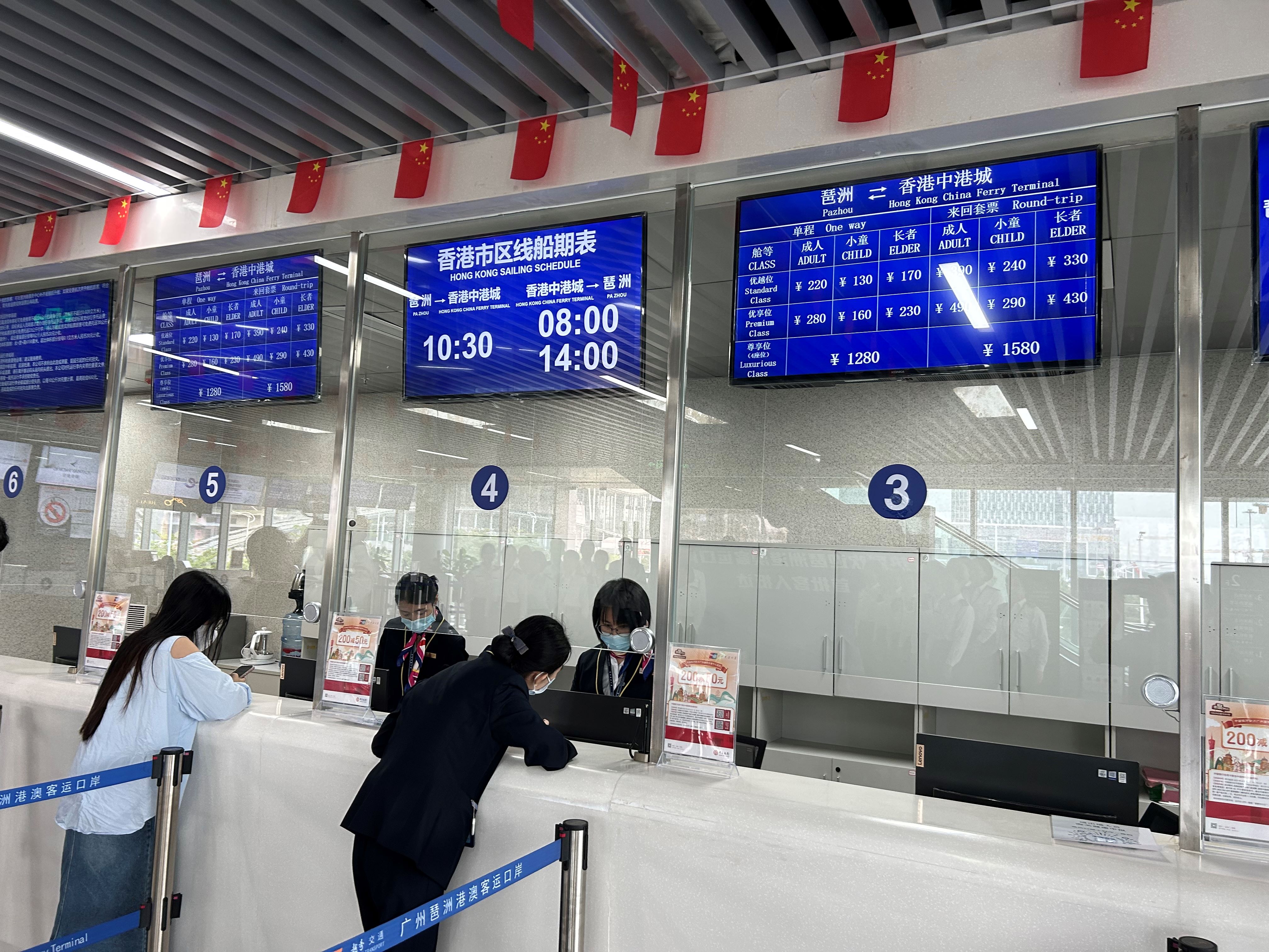 7月14日上午,琶洲港澳客運口岸(以下簡稱「琶洲口岸」)出境大廳人流涌動,廣州海關所屬廣州會展中心海關關員正忙碌地為即將搭乘「海珠灣」號客輪前往香港國際機場的旅客辦理通關手續。