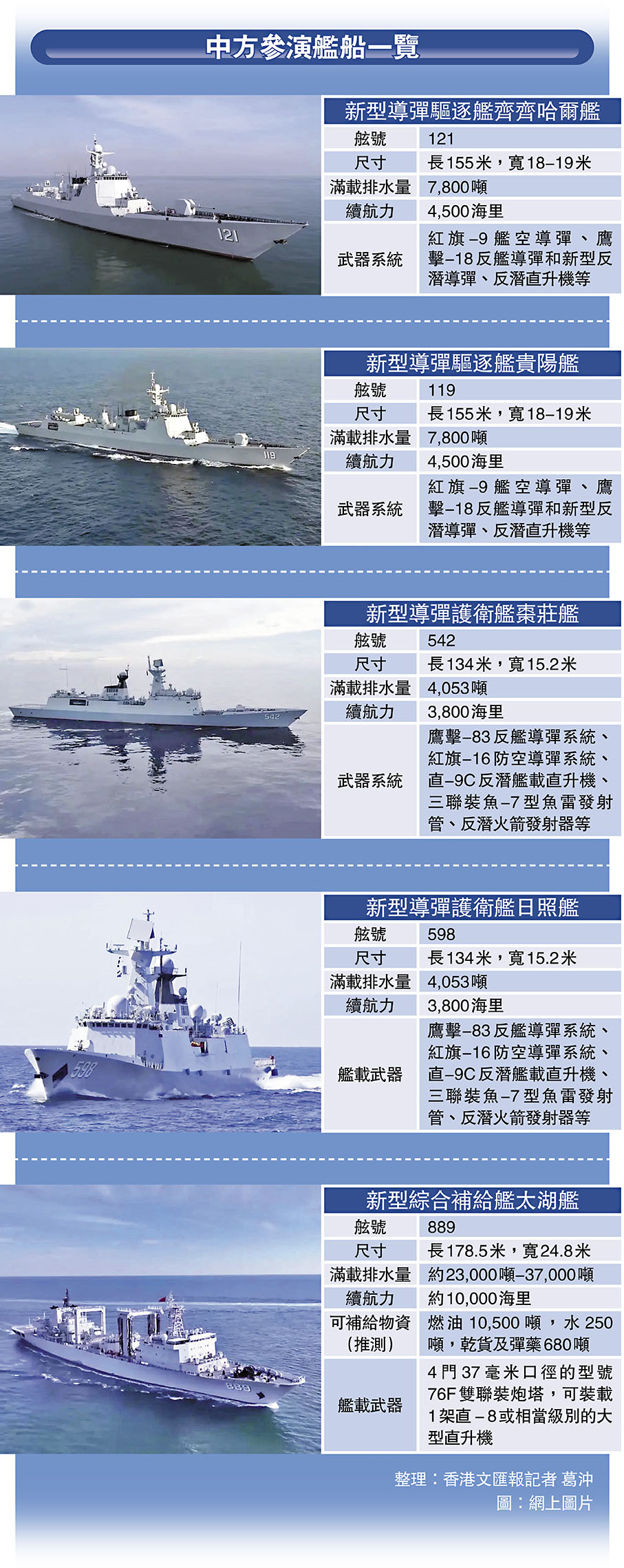 此次中方海上編隊由導彈驅逐艦齊齊哈爾艦、貴陽艦,導彈護衛艦棗莊艦、日照艦,以及綜合補給艦太湖艦組成,攜帶艦載直升機4架。資料顯示,艦艇均為海軍主力戰鬥裝備,曾多次參加重要演練和任務。