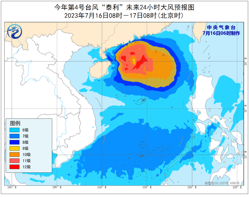 大公文匯全媒體報道,中央氣象台今日(16日)發布颱風藍色預警。颱風「泰利」(Talim)已於今天凌晨2時由熱帶風暴級加強為強熱帶風暴級,其中心今天早晨5時位於我國東沙島偏南方向約215公里的南海東北部海面上,就是北緯18.7度、東經116.6度,中心附近最大風力有10級(25米/秒),中心最低氣壓為985百帕,七級風圈半徑280公里。