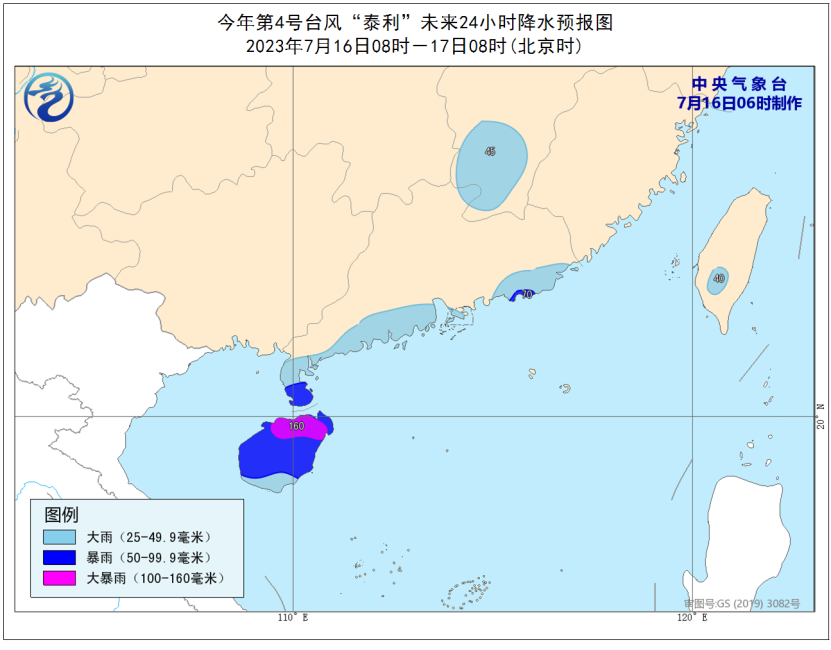 中央氣象台預計,颱風中心將以每小時15公里左右的速度向西北方向移動,強度逐漸增強,並於17日夜間在廣東台山到海南文昌一帶沿海登陸(颱風級或強颱風級,35-42米/秒,12-14級),18日進入北部灣,以後趨向越南北部沿海和廣西沿海。