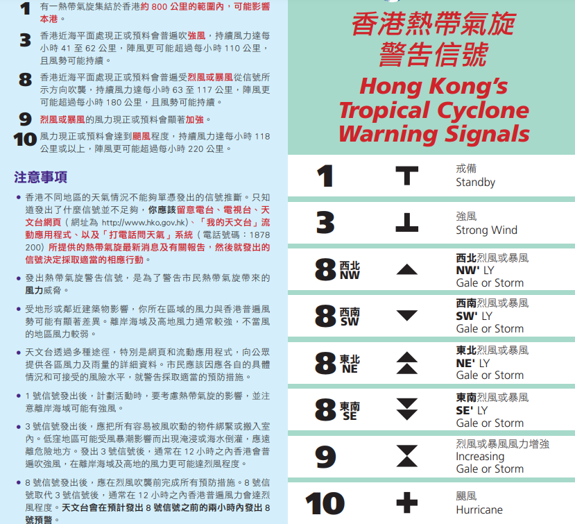 八號及以上風球:大多數公共交通工具會停止服務,商場內的店舖停止營業、主題公園暫停開放,所有學校停課,打工仔可以不用上班!