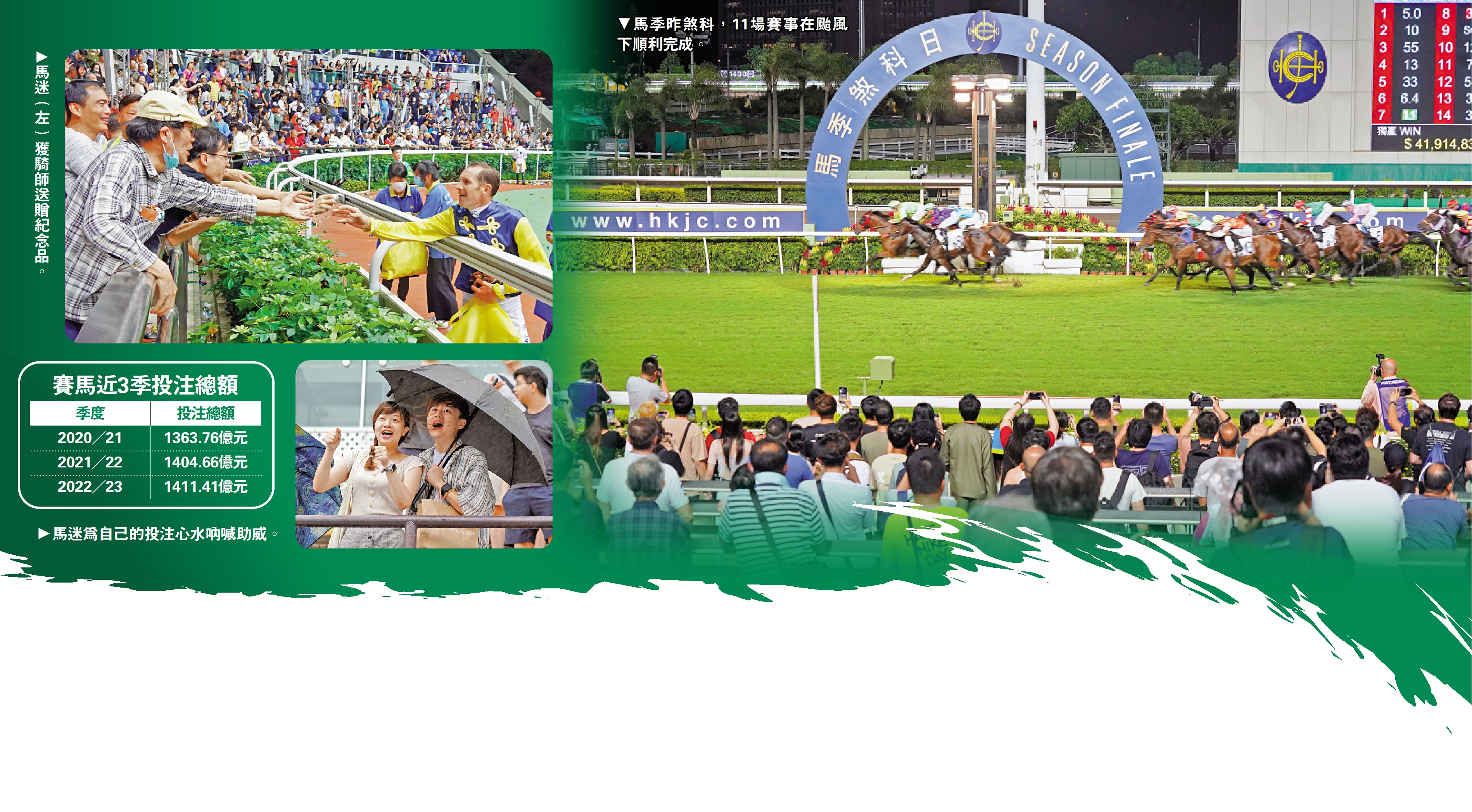 (大公報記者 黃智佳、黃智佳、林良堅)2022至2023年度馬季昨天在沙田馬場煞科,即使天文台懸掛3號強風信號,而且下着傾盆大雨,但11場賽事排除萬難完成,順利為本季畫上完美句號。精彩的賽事吸引本地馬迷外,不少訪港遊客也慕名入場,享受熾熱的緊張氣氛,欣賞賽後的頒獎禮和表演,猶如置身嘉年華。香港賽馬會公布,本季投注總額為1411億元,較上季微升0.5%,煞科日投注額20.65億元更創回歸以來新高,真的旺丁又旺財。
