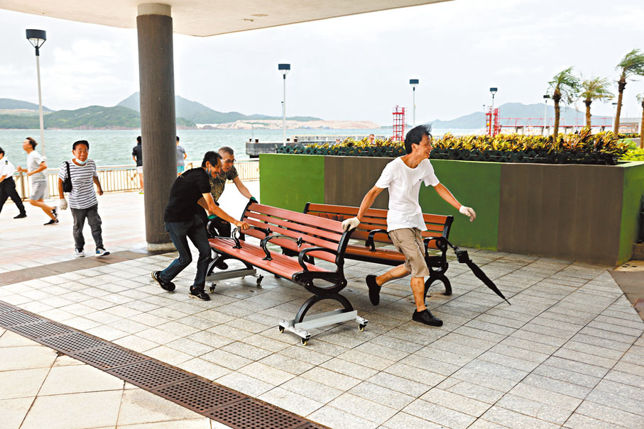 在杏花邨海旁,昨日傍晚開始風勢逐漸增強,管理處派出工作人員用橙色帶圍封岸邊部分地方,防止市民接近,以免遭大浪捲走。另又將部分露天座椅拆除運走,並在停車場出入口放置沙包和水閘,防止海水倒灌淹浸。而近海邊的單位,住戶亦特意在玻璃窗貼膠紙,以減少玻璃窗遭遇強風破裂的機會。