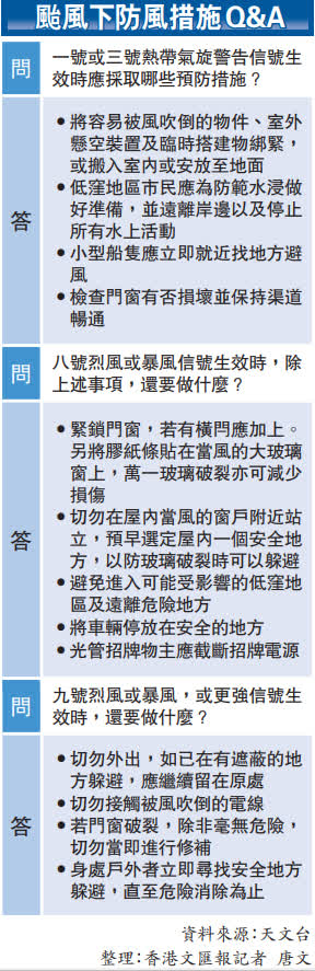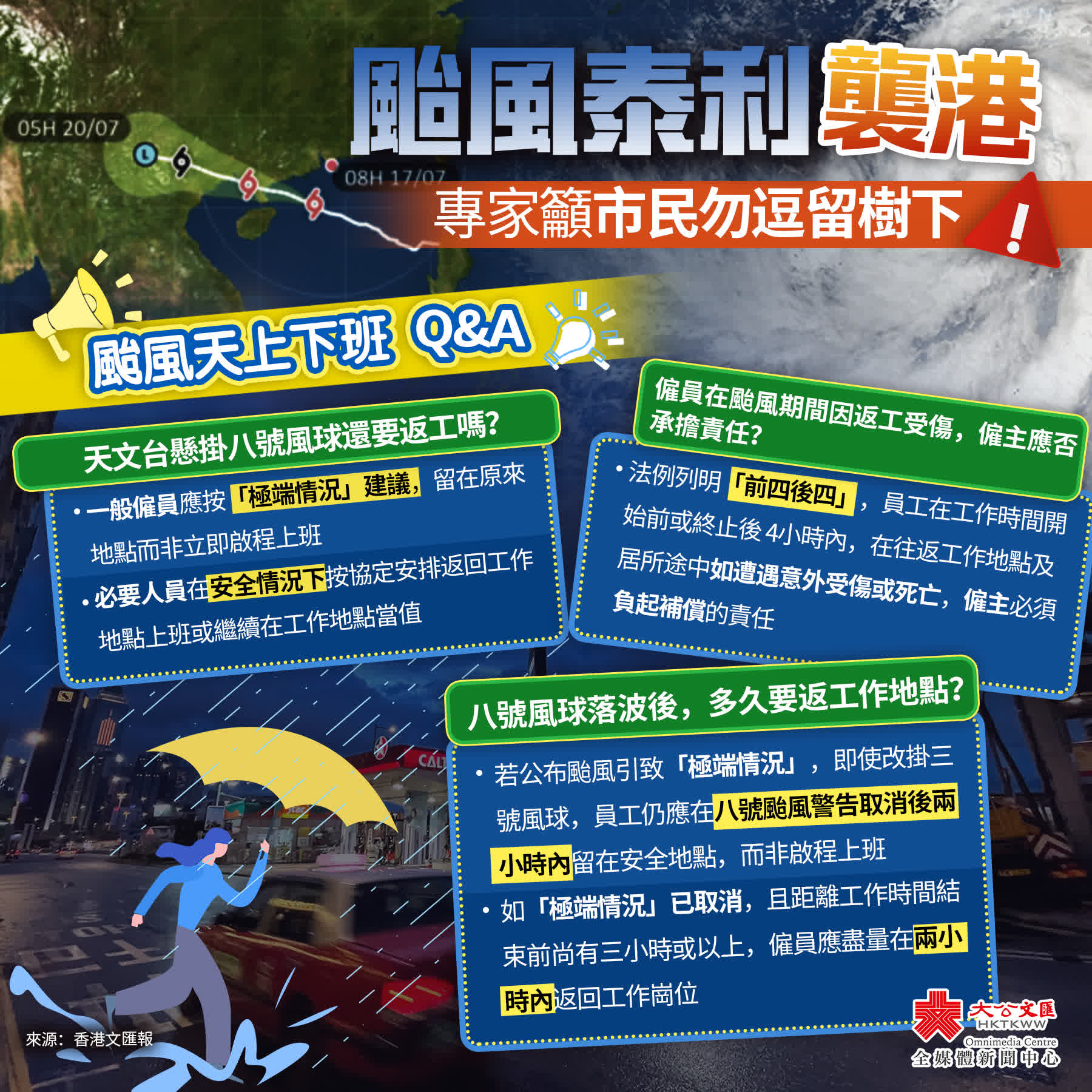 (香港文匯報記者 劉明、蕭景源)颱風「泰利」來襲,香港今日零時40分發出今年首個八號烈風或暴風信號。受颱風影響,本港昨晚風勢漸增強,天文台指出按預測路徑,「泰利」今日凌晨最接近本港,將在香港以南約300公里內掠過,風勢今早會進一步增強,而本港沿岸低窪地區可能出現淹浸情況。昨午三號強風信號生效期間,港島南灣泳灘已有大樹難抵強風倒塌,造成一名女子受傷。天文台、消防處和發展局均提醒巿民要做好防風措施,避免身處當風地點及遠離岸邊等危險地點,以免受到損傷。有樹木專家透過香港文匯報提醒市民,打風期間要留意樹木情況,倘發現樹幹有腐爛情況和樹木高大,應避免在樹下逗留。