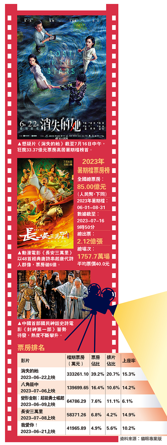 根據貓眼專業版數據,今年暑期檔約有116部影片集中上映,在數量上基本回歸新冠疫情前水平。暑期檔剛開始,市場熱度和票房貢獻主要依靠《變形金剛:超能勇士崛起》《速度與激情10》《蜘蛛俠:縱橫宇宙》等進口片,而暑期檔市場真正「熱」起來,還是從端午節《消失的她》開始,截至7月16日中午12時,該片已狂攬33.37億元票房,僅次於《滿江紅》和《流浪地球2》,位列2023年內地票房第三位;在中國電影總票房榜上,《消失的她》接近周星馳《美人魚》33.91億元的票房,位列第十四位。