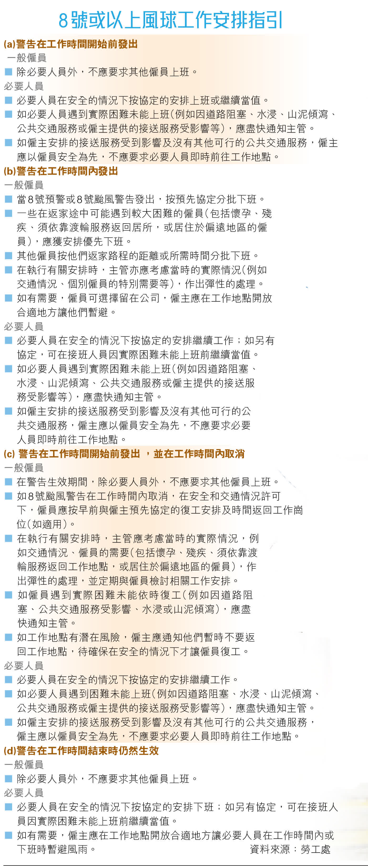 根據勞工處守則,天文台會因應風力強度發出警告信號,一般會在8號颱風警告前兩小時內宣布,僱主應在充裕時間及實際情況下,提早讓僱員分批下班。