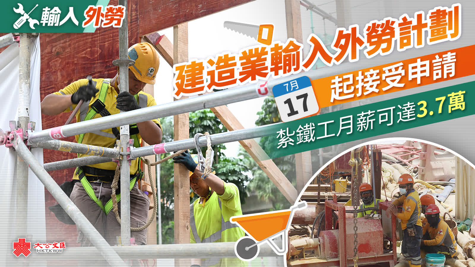 大公文匯全媒體報道,建造業輸入勞工計劃今日(17日)起接受申請,配額上限為1.2萬個,共29個技術工人工種和18個技術員及工地督導人員職位接受申請。首輪申請截止日期為8月16日。