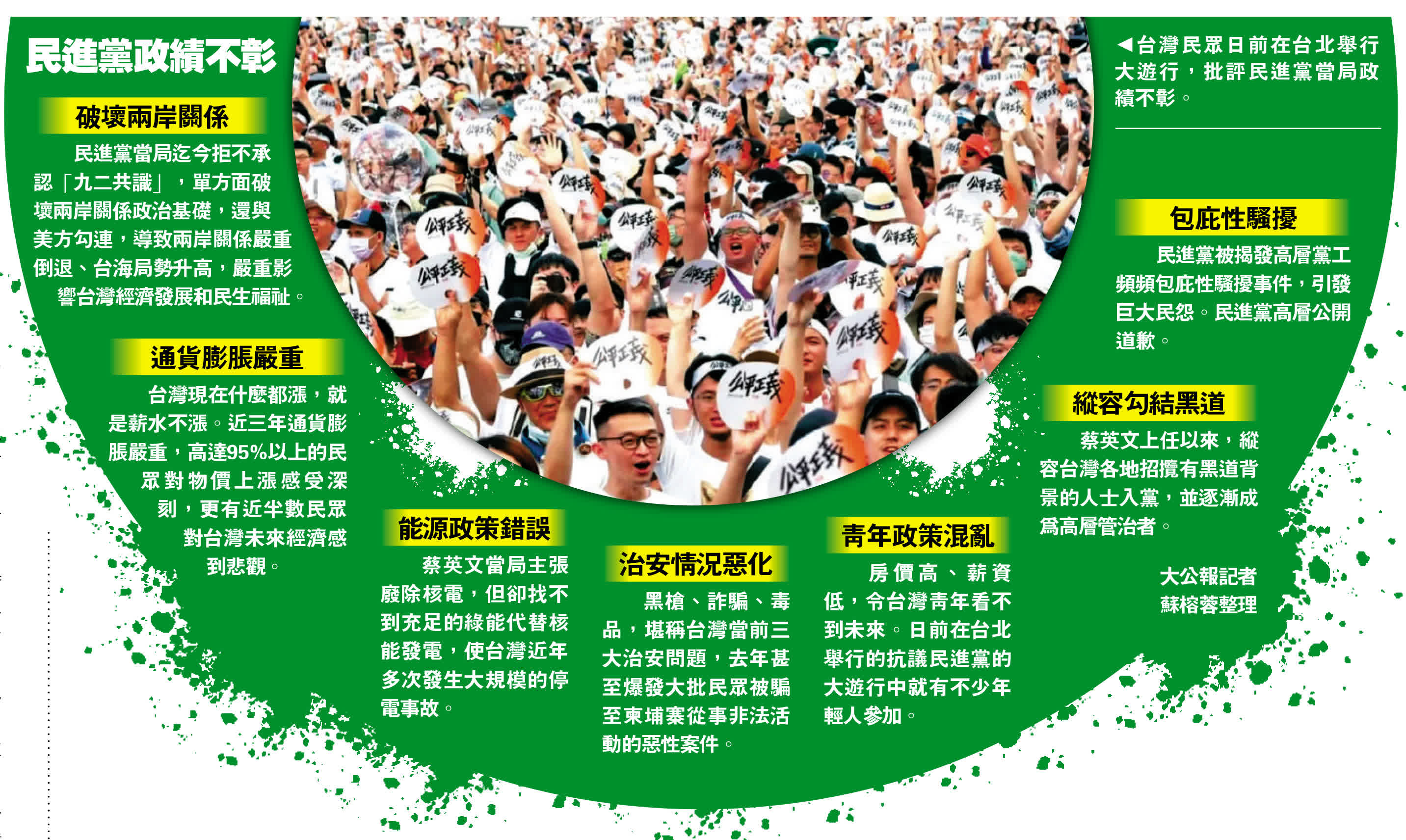 另據大公報記者蘇榕蓉報道:新黨副發言人游智彬向大公報表示,有80%的島內民眾認為對民進黨上台執政七年多來的業績非常不滿意,不滿意度已超過民進黨的基本盤。民進黨執政前後加起來有15年,陳水扁8年再加上蔡英文7年,許多政見都是口號,民眾覺得被騙,加上低薪,還有詐騙橫行,導致民怨沸騰。