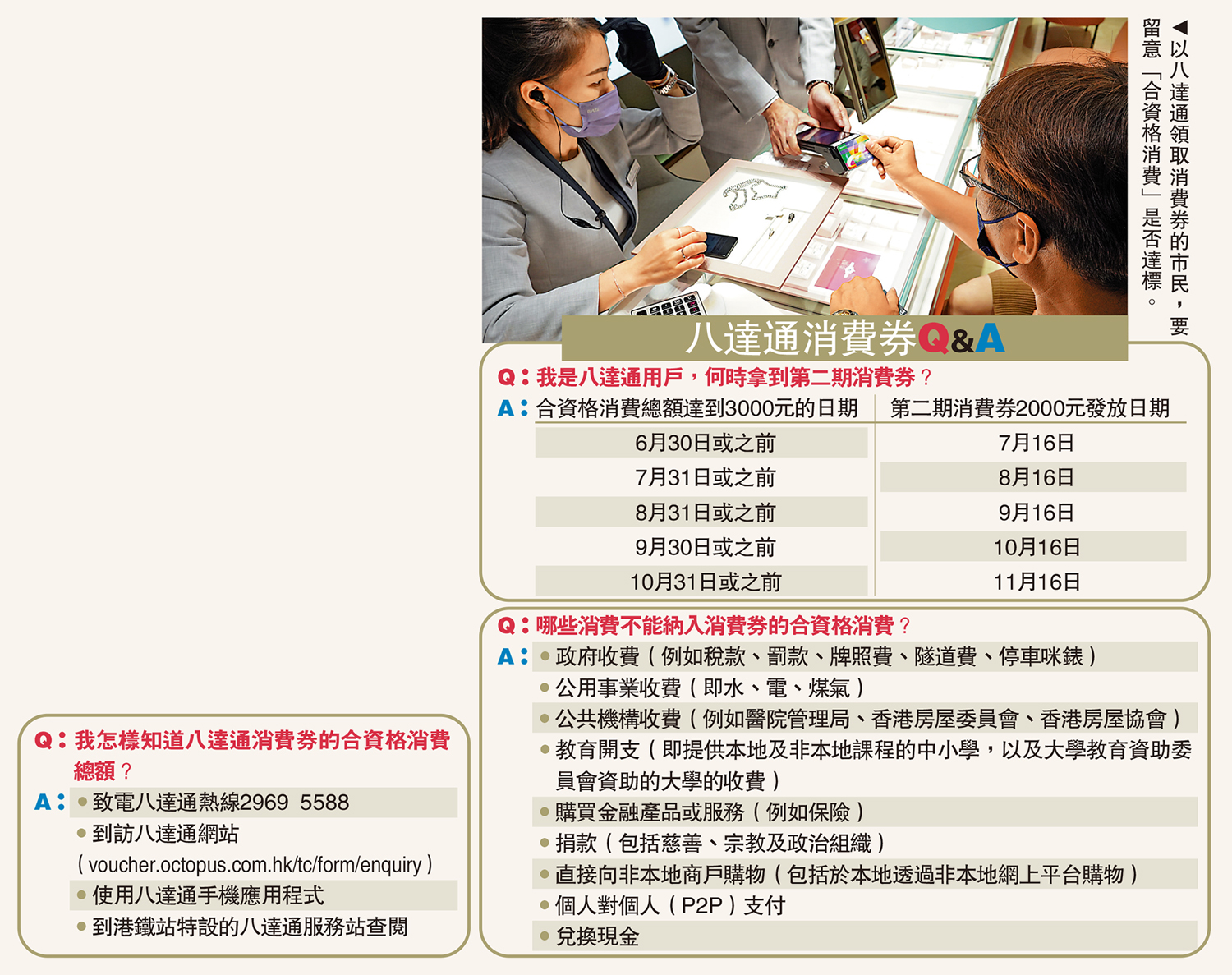 市民若未能於本月16日通過八達通收到消費券,最遲須在10月31日或之前符合累積「合資格消費」要求。市民只需要在月底前「合資格消費」額達標,便可在翌月的16日取得第二期消費券。市民可通過八達通熱線、官方網址、手機App及港鐵站內的八達通服務站查詢合資格消費總額。