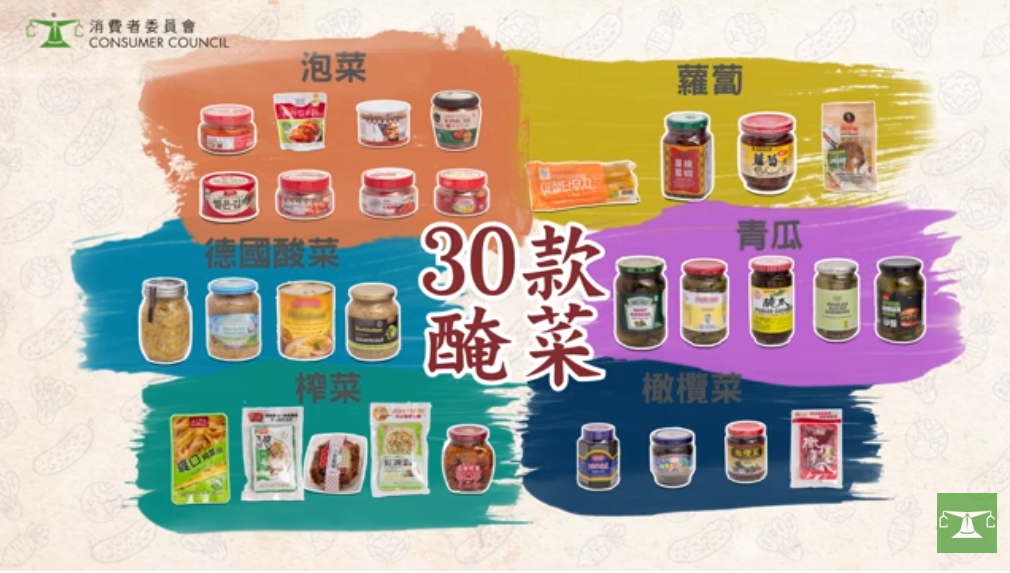 消委會今次揀選的30款包裝醃菜樣本包括8款泡菜、4款德國酸菜(sauerkraut)、5款青瓜、5款榨菜、4款蘿蔔和4款橄欖菜,每包或每瓶售價介乎4.3元至82元不等。當中26款樣本的鈉含量偏高,每100克的鈉含量介乎641毫克至3080毫克;另有兩款屬於高糖,4款屬於高脂。