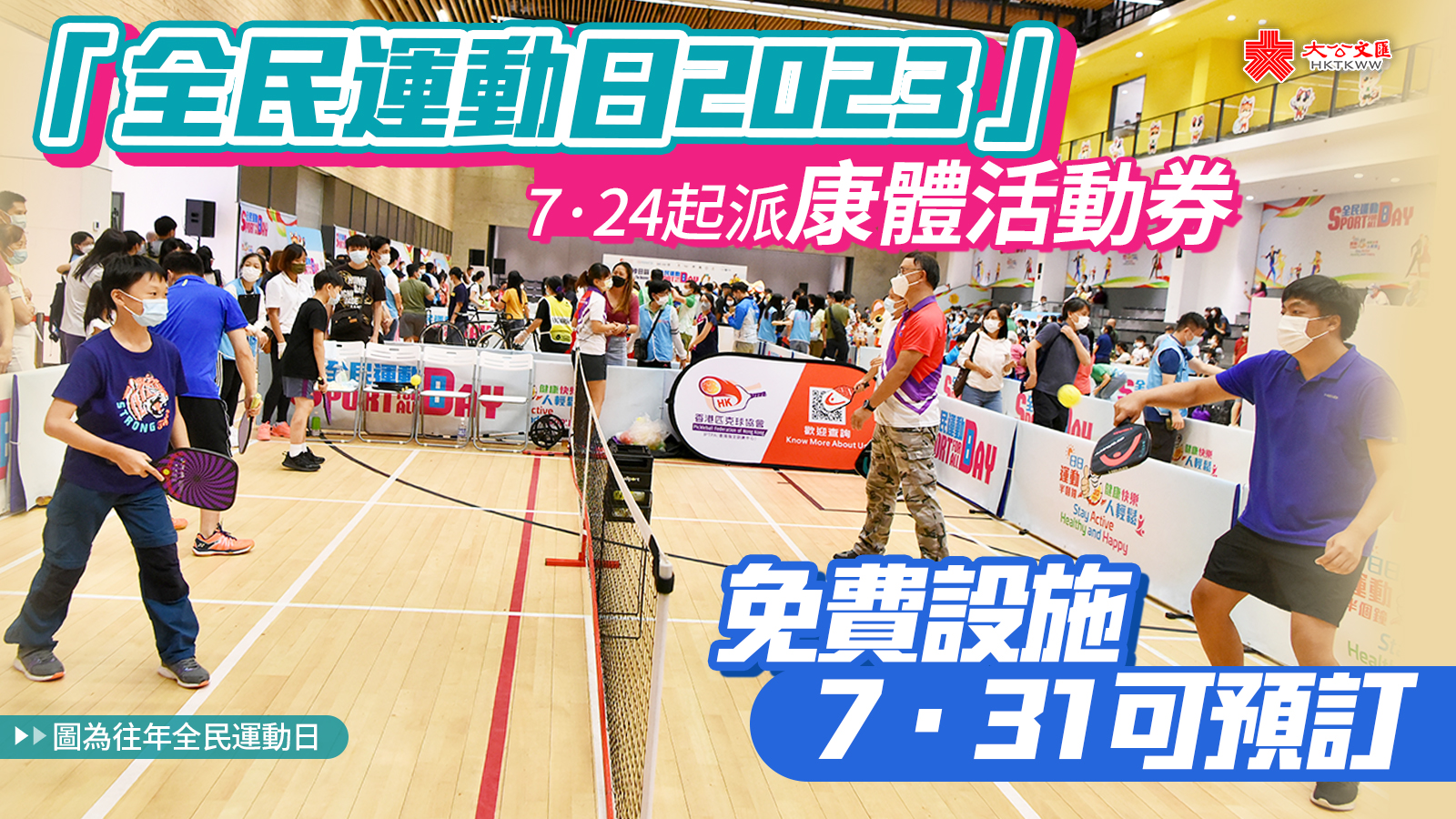 大公文匯全媒體報道,康文署下星期一(24日)起,派發8月6日(星期日)舉行的「全民運動日2023」免費康體活動券,屆時巿民可憑券參加十八區指定體育館舉辦的多元化免費康體活動。
