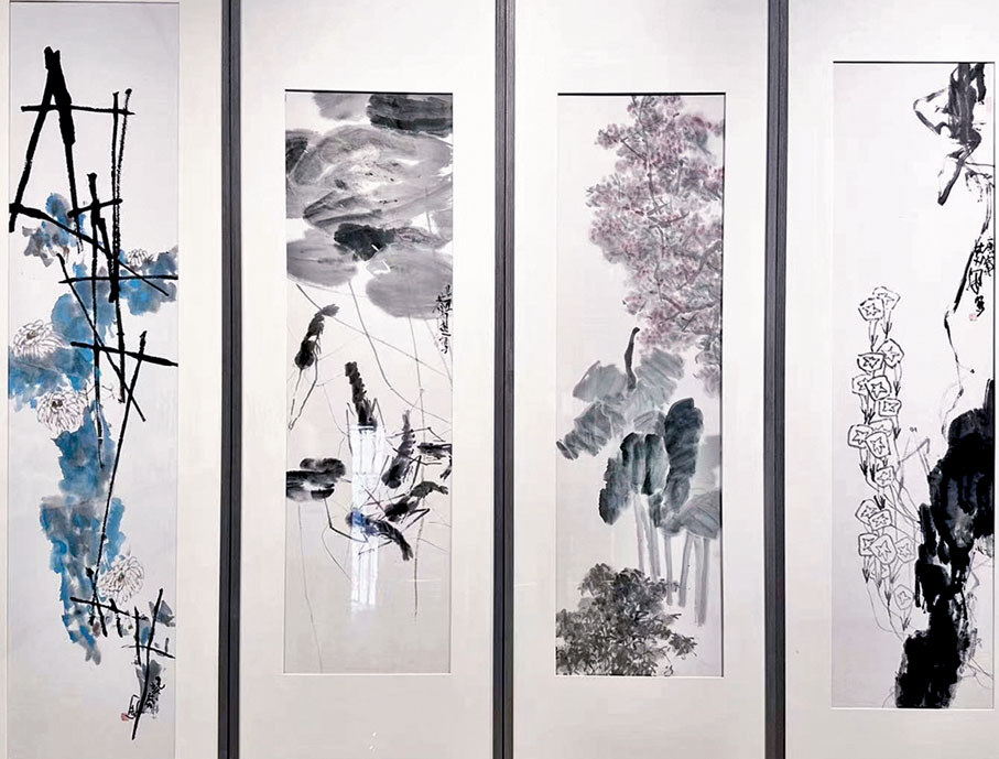 記者在展廳觀看郭莽園的作品,不管是花鳥蟲魚,還是人物山水,用筆極其靈活,點染反側,飄逸靈動,筆墨點線不是被動地服從於形構,而是可以獨立成趣;構圖極盡奇拙,如無法無天又似在情理之中,觀者常常為其提心吊膽而又隨即恍然大悟。而水墨的運用則大膽潑辣,墨色無論深淺,均能渾厚飽滿,極具衝擊力。