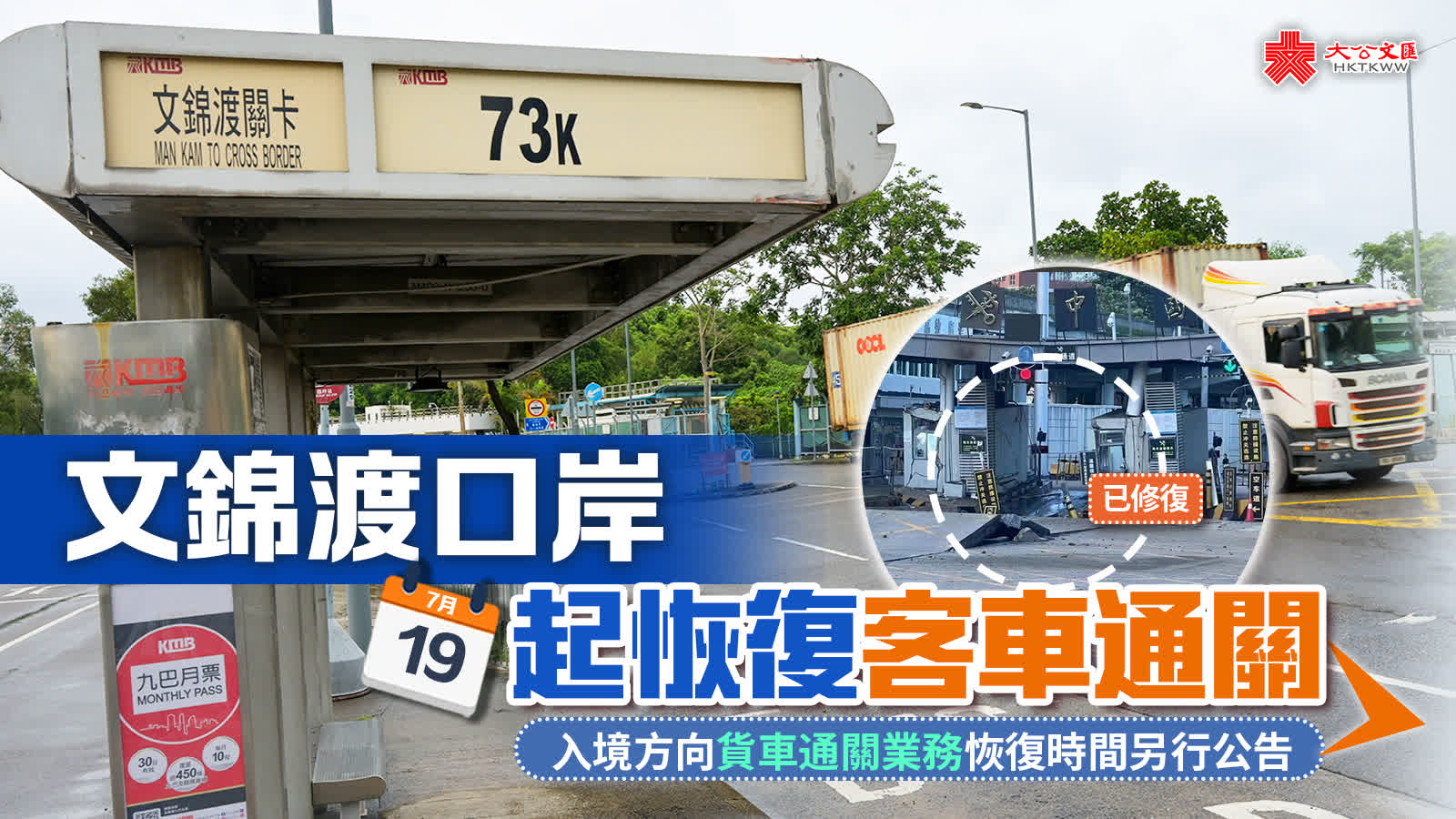 (香港文匯報記者 李昌鴻 深圳報道)深圳市人民政府口岸辦公室昨日發布公告表示,7月9日文錦渡口岸出現地面沉降,入境客、貨車通關業務暫停。經過奮力搶修,專業機構全面安全評估,現定於7月19日上午7時起恢復入境方向客車通關業務(包括小車及大客車),入境方向貨車通關業務恢復時間另行公告。