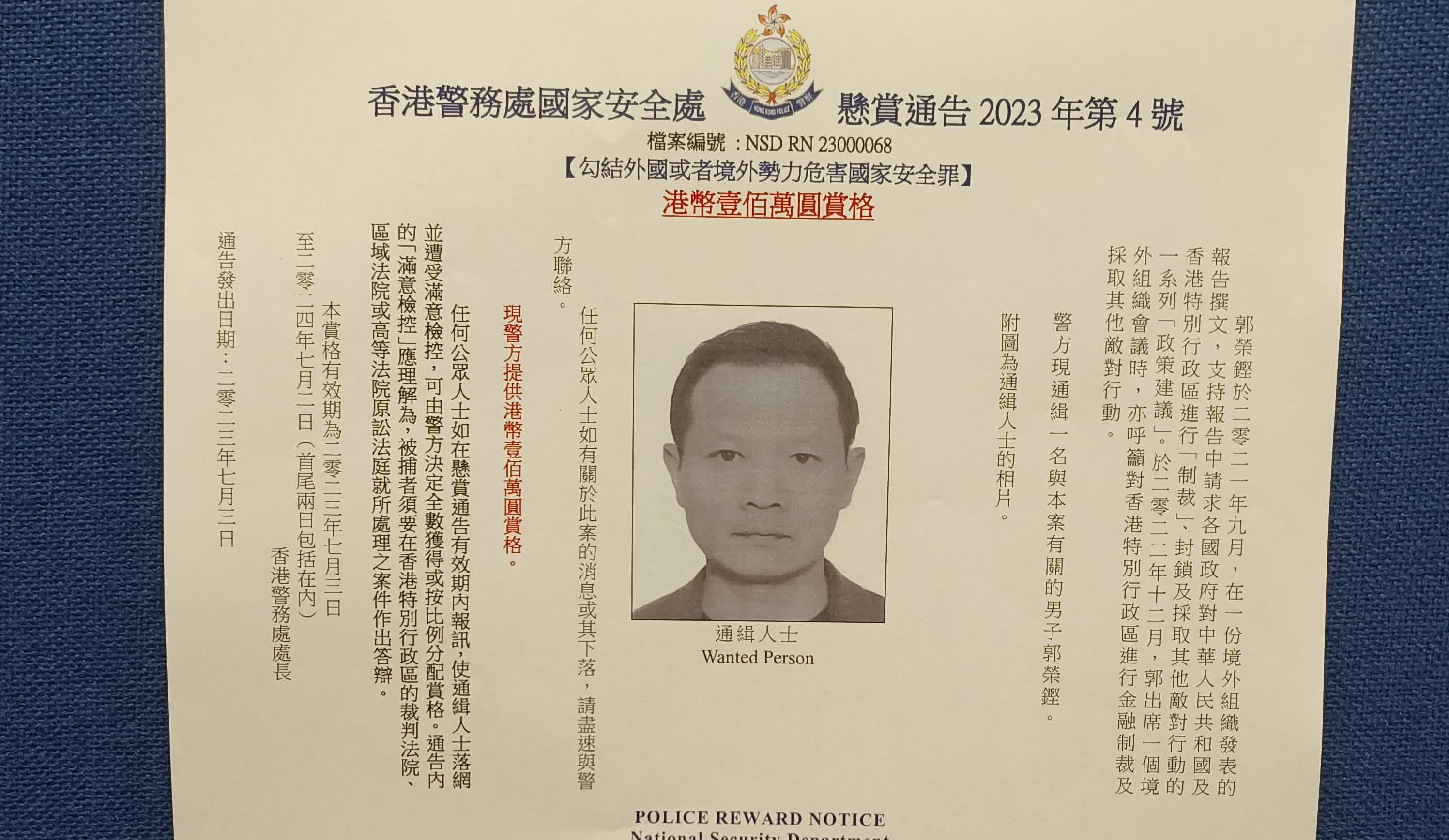 通緝令指,郭榮鏗涉勾結外國或境外勢力危害國家安全罪,在海外勾結反華組織及政客,請求外國對中國及香港特別行政區「制裁」,包括倡議極端措施,破壞香港聯匯制度,意圖打擊香港金融中心地位。