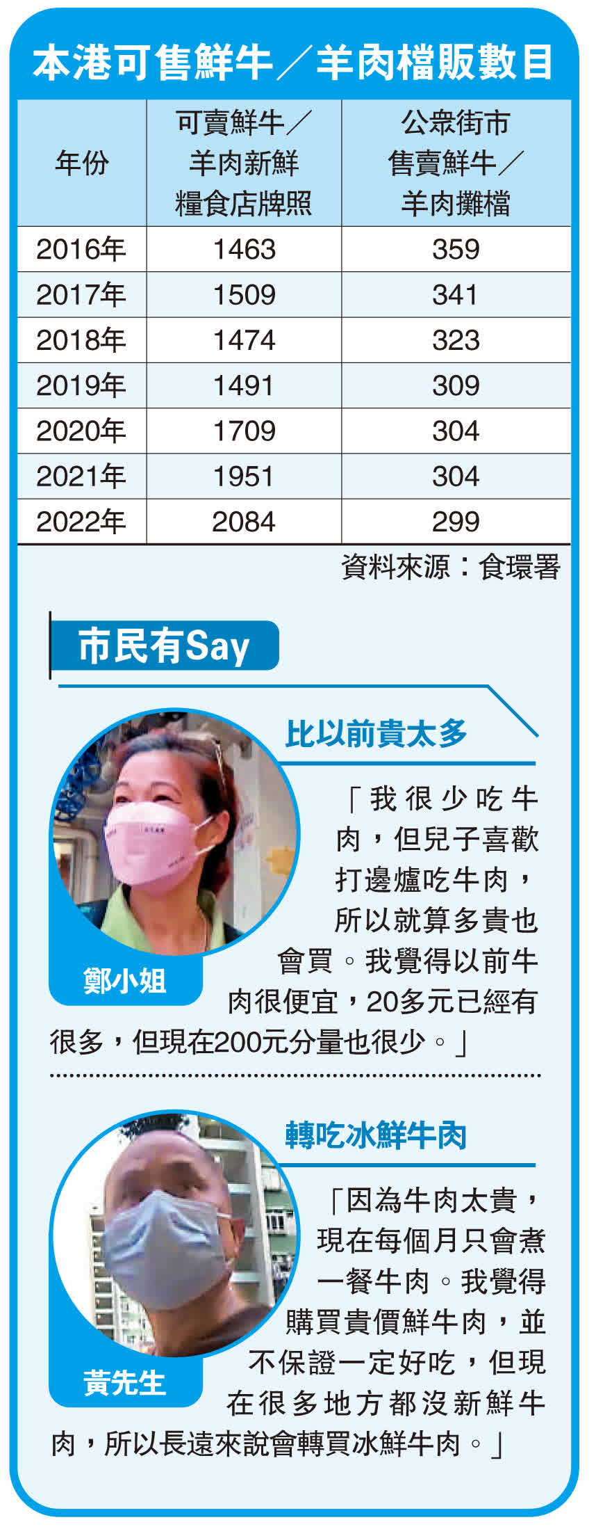 按照食環署資料,去年公眾街市售賣新鮮牛肉/羊肉只有299檔,較2016年的359檔減少近兩成。近半年來,本港每月進口活牛的數目約為900多頭,即每日只有約30頭,而肥牛平均每擔批發價為5710元,肉牛平均每擔批發價為4970元。