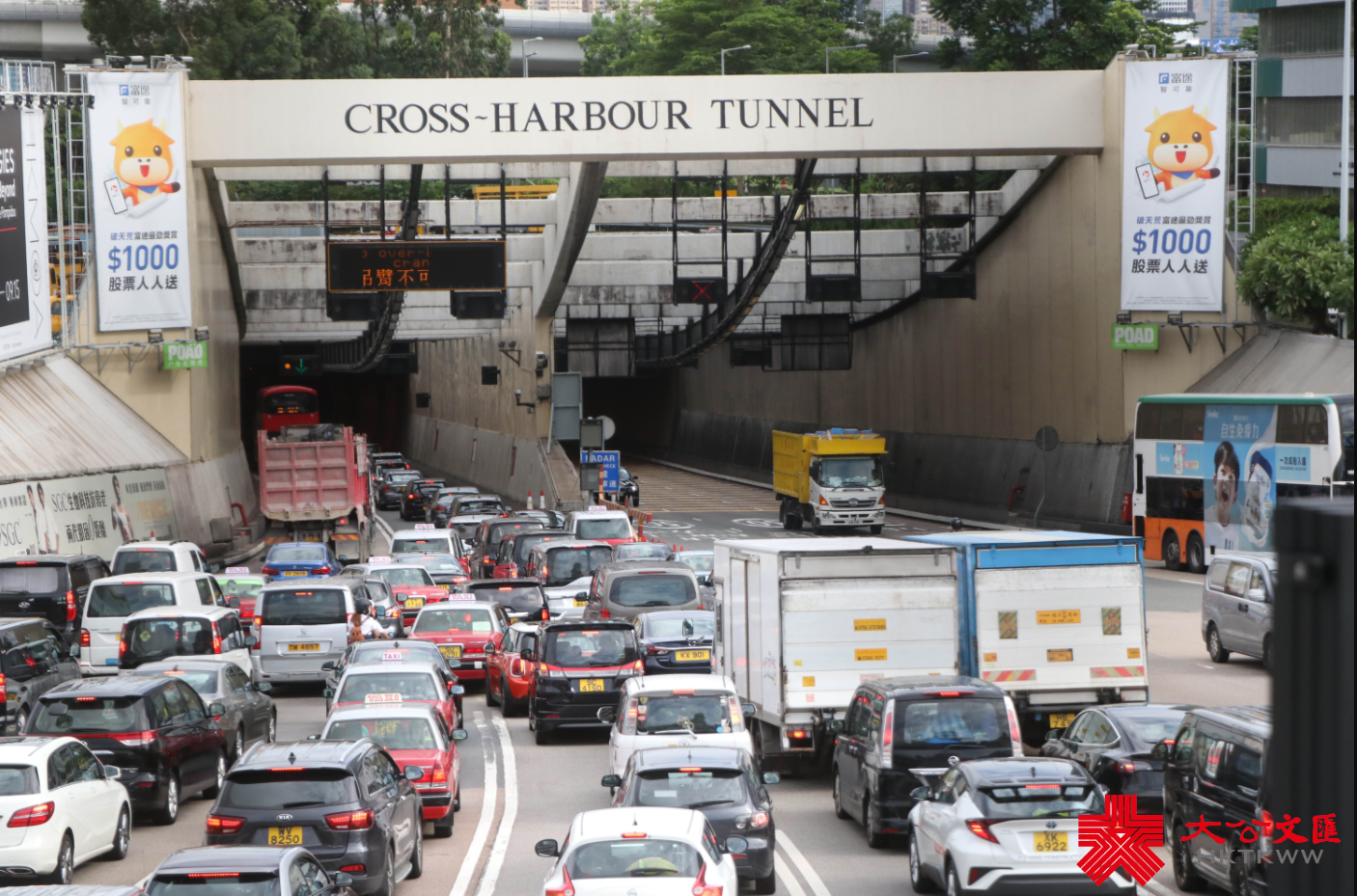 2、紅隧收費廣場由來回方向各8條行車線,減至各4條線。
