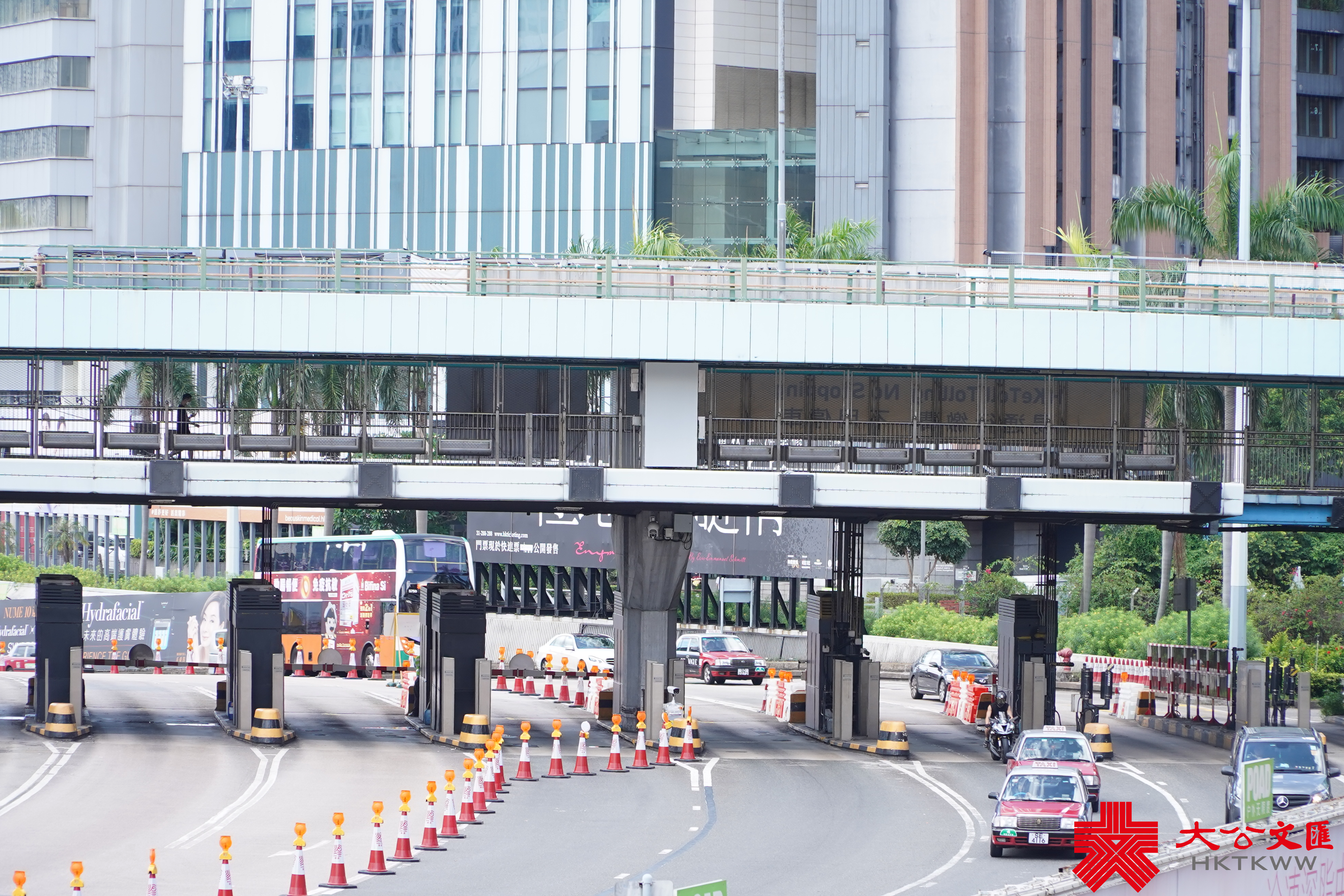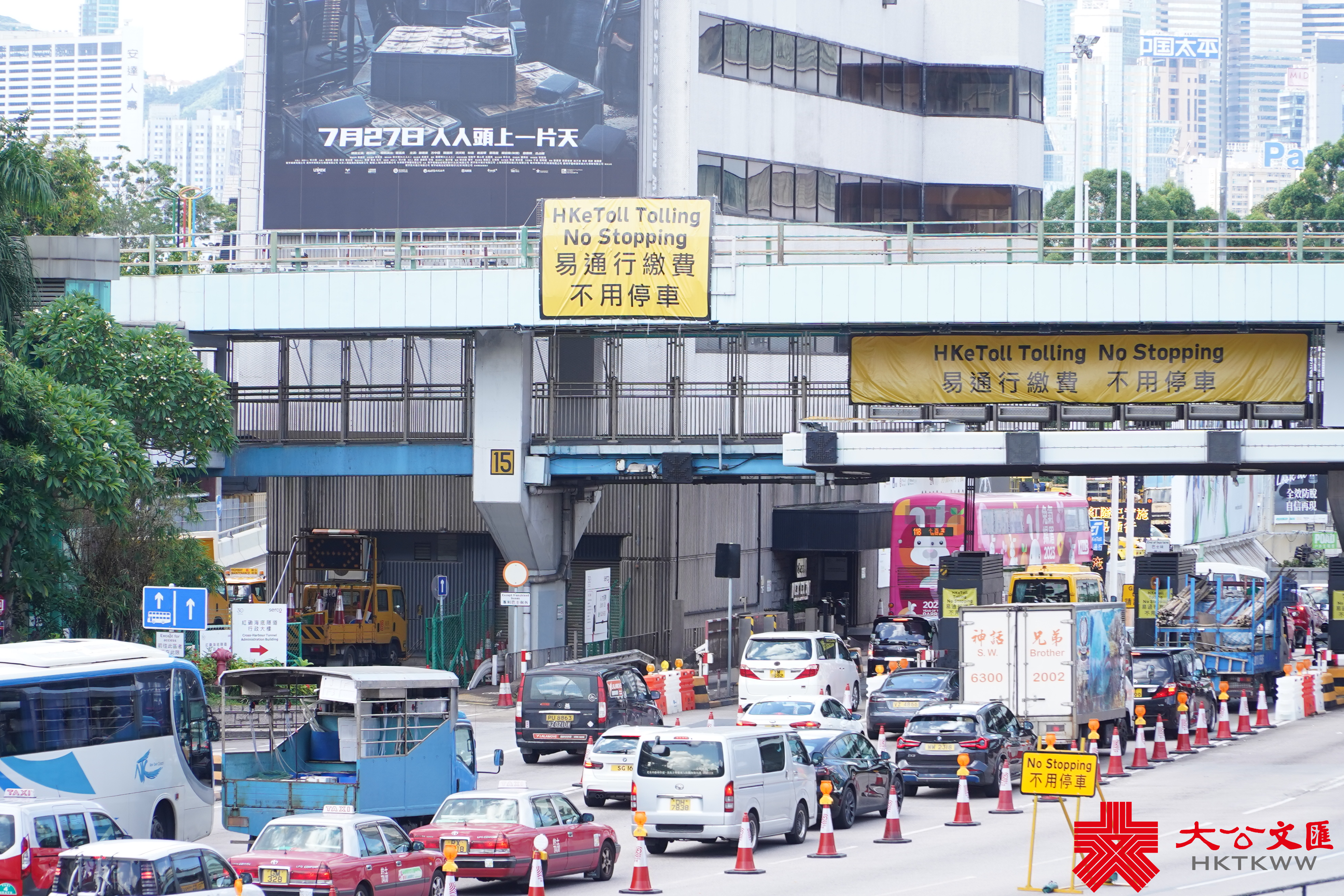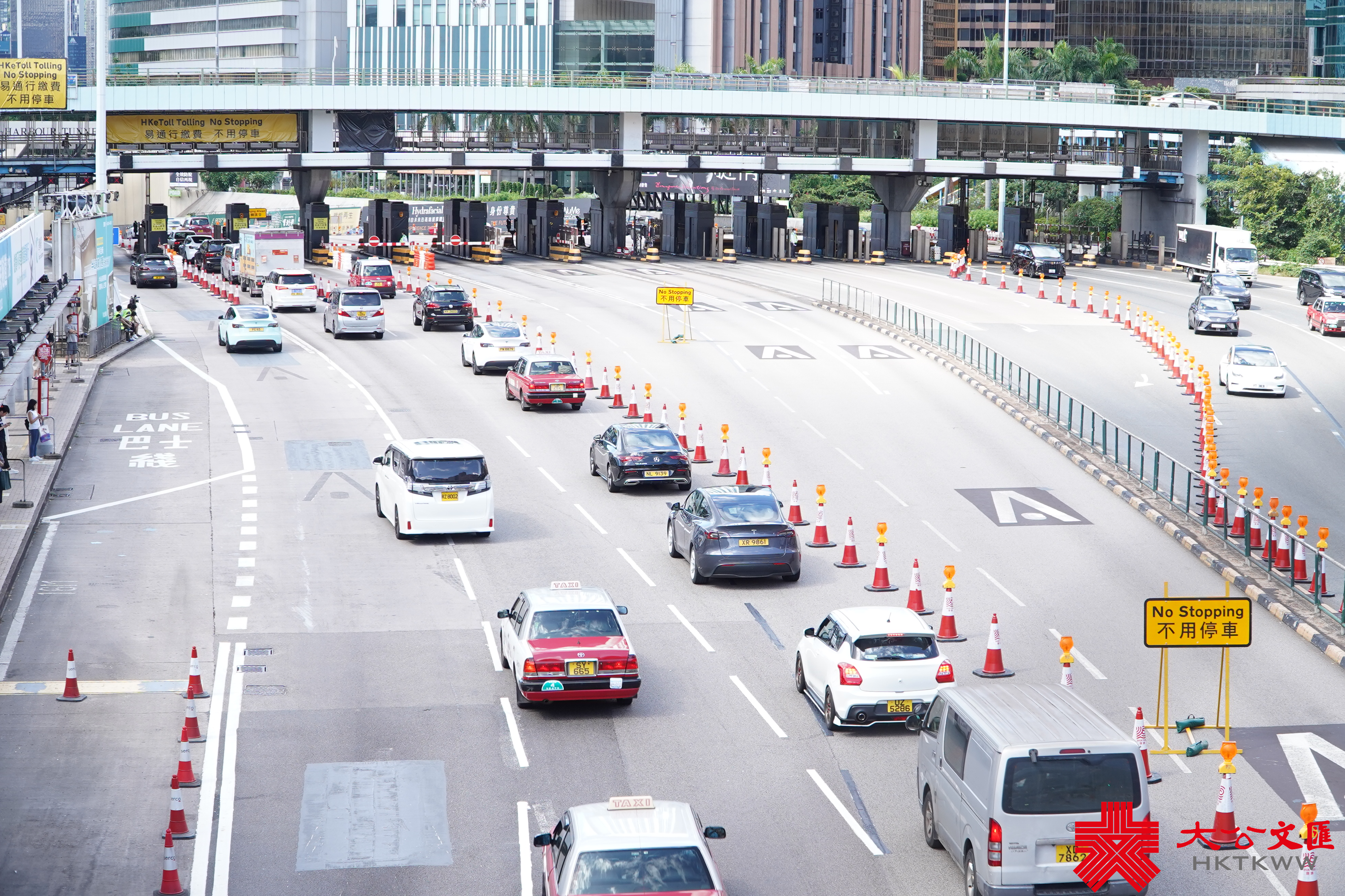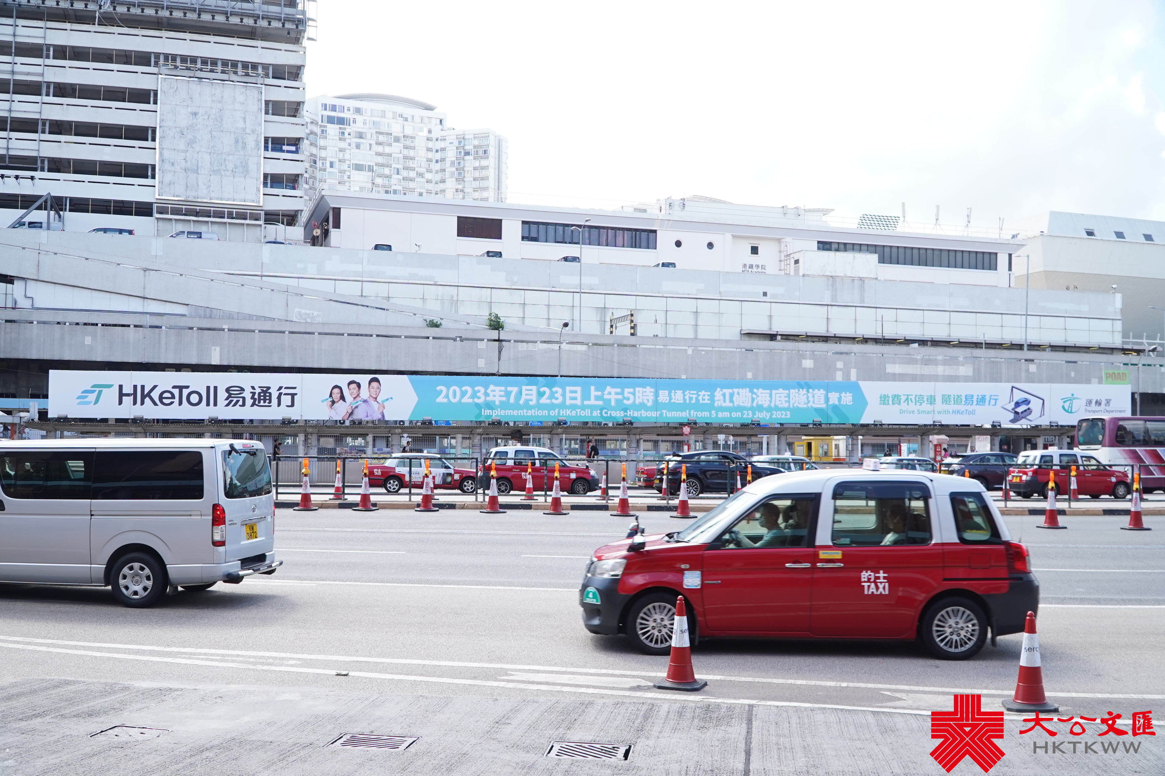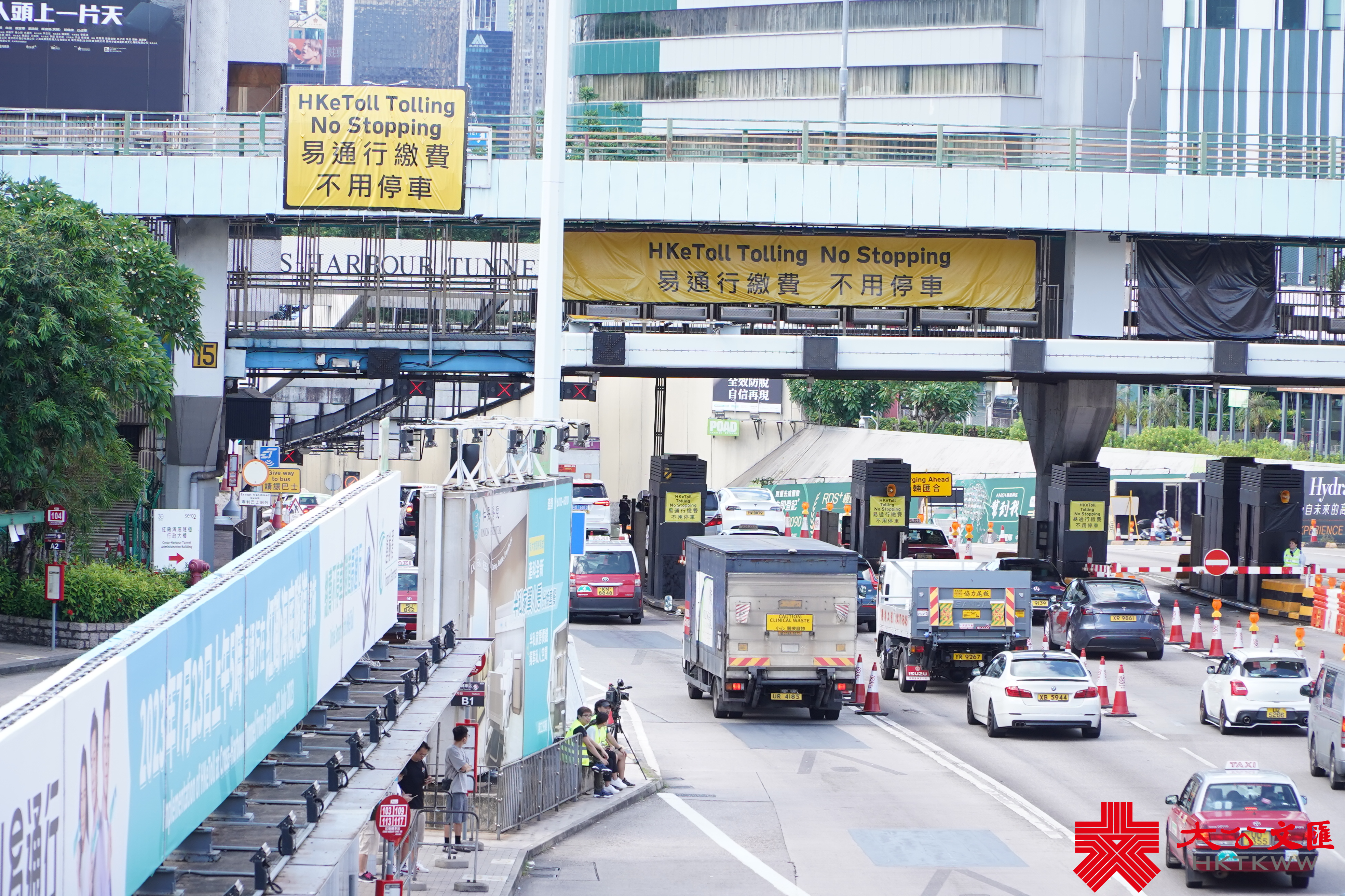 (大公文匯全媒體記者 李九歌)「易通行」今早(23日)5時起在紅磡海底隧道實行。大公文匯全媒體記者於現場見到,紅隧收費廣場所有人工收費亭及快易通車道已經取消。來回各8條行車線,已改為各4條行車線,巴士以外的駕駛者可靠左邊3條行車線行駛。在收費點前約200米距離,設有「不用停車」黃色指示牌。