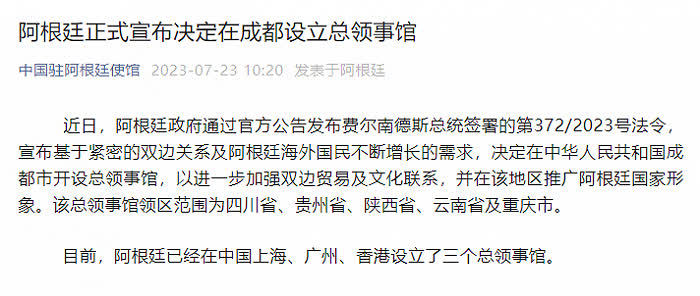 據中國駐阿根廷使館公眾號消息,近日,阿根廷政府通過官方公告發布費爾南德斯總統簽署的第372/2023號法令,宣布基於緊密的雙邊關係及阿根廷海外國民不斷增長的需求,決定在中華人民共和國成都市開設總領事館,以進一步加強雙邊貿易及文化聯繫,並在該地區推廣阿根廷國家形象。該總領事館領區範圍為四川省、貴州省、陝西省、雲南省及重慶市。
