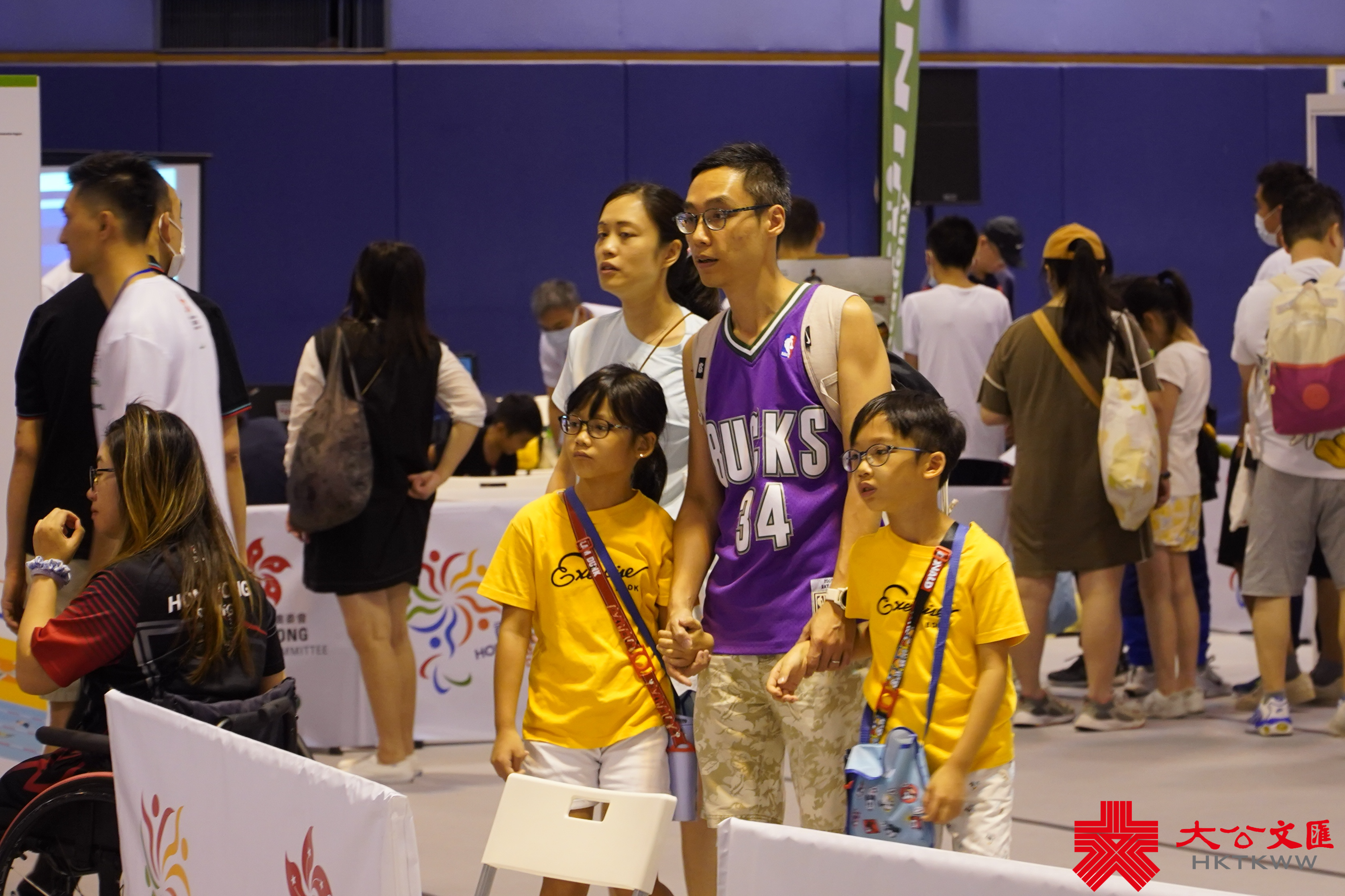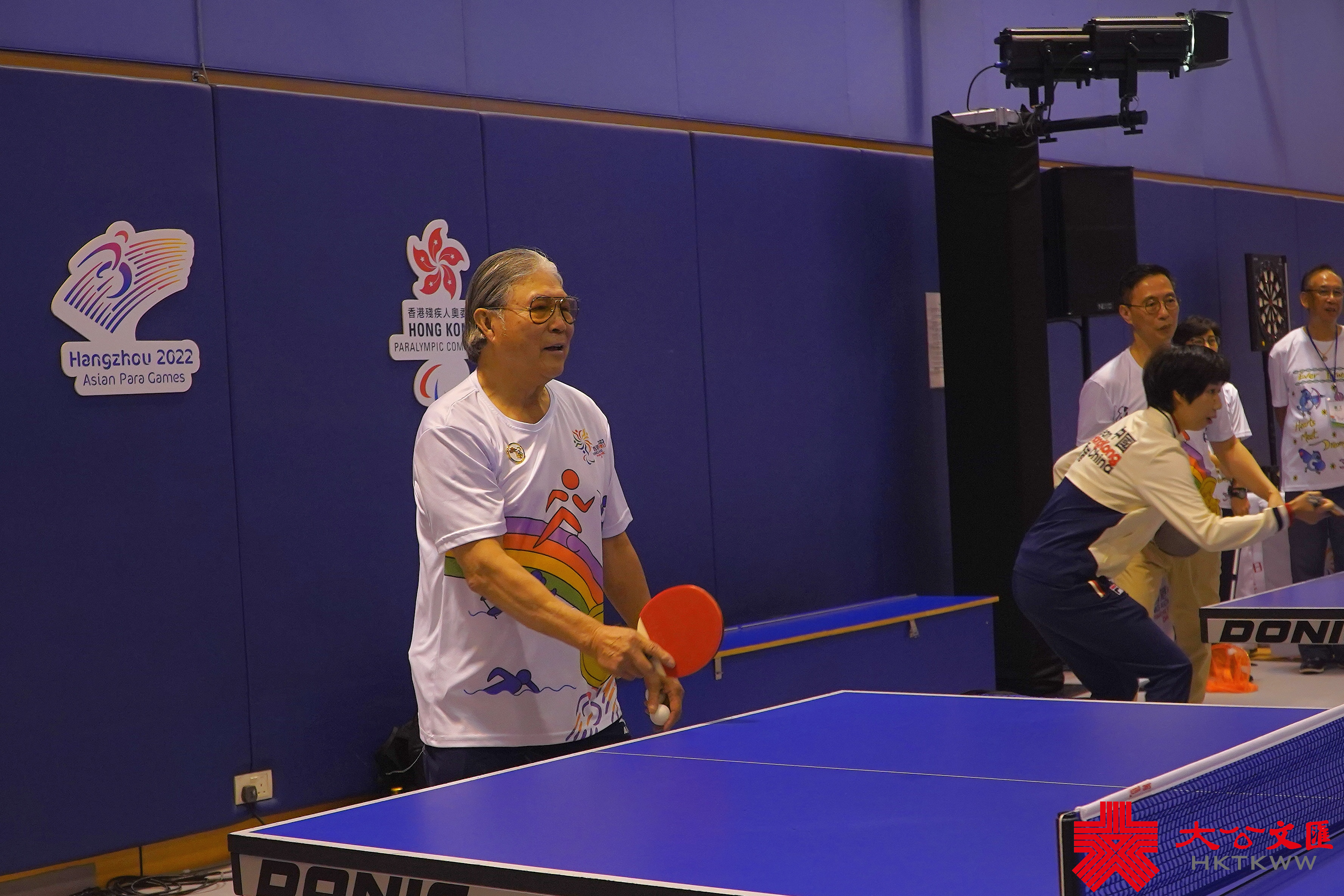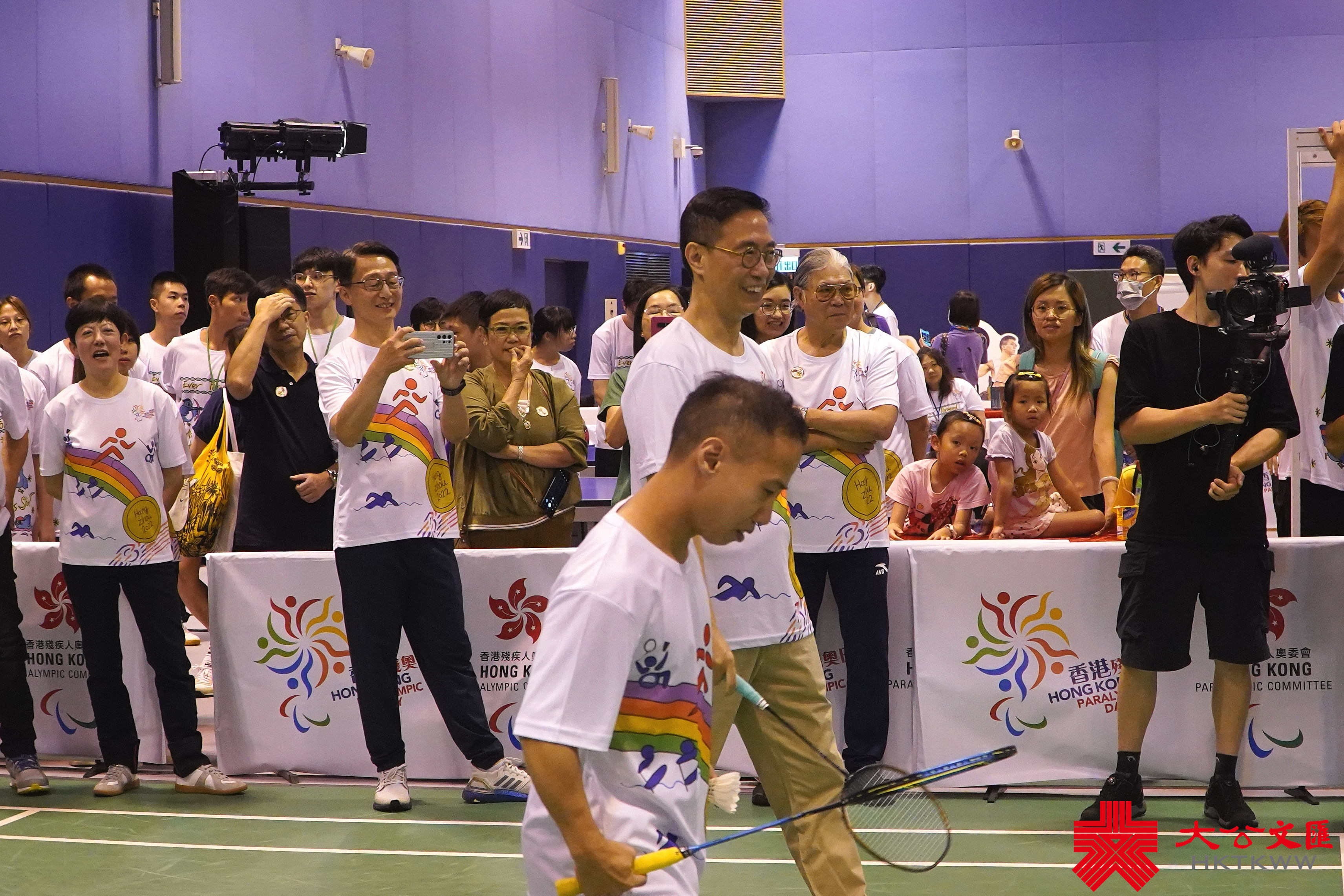 隨後,包括文化體育及旅遊局局長楊潤雄、中國香港體育協會暨奧林匹克委員會會長霍震霆、立法會議員鄭泳舜等嘉賓體驗殘疾乒乓球及羽毛球試玩活動,吸引大批人士圍觀,攜手推動傷健共融,氛圍十分熱鬧。