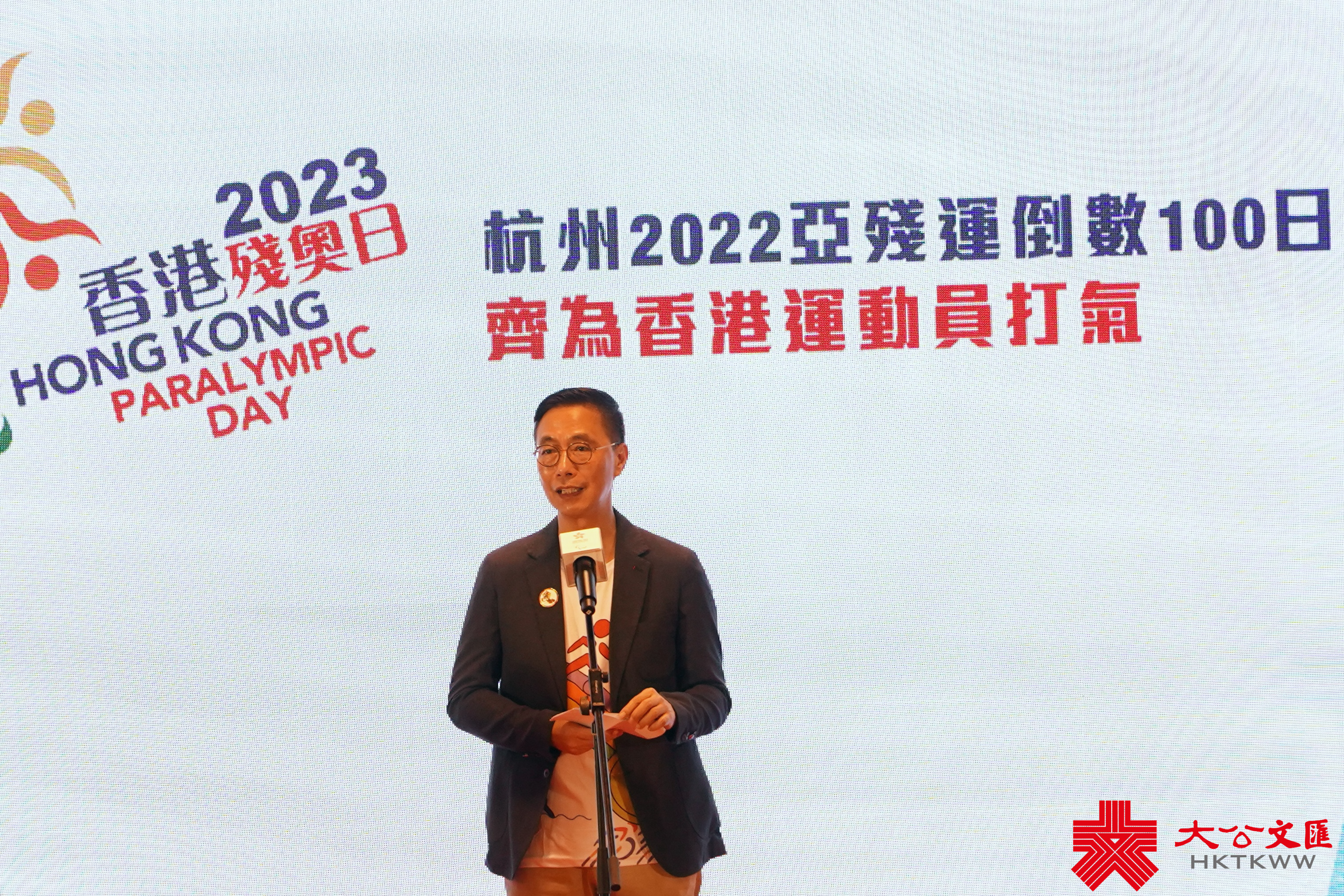 (大公文匯全媒體記者 李九歌)為迎接杭州2022亞殘運倒數100日的來臨,由香港殘疾人奧委會主辦的「香港殘奧日2023」今日(23日)於香港體育學院舉辦。活動邀請文化體育及旅遊局局長楊潤雄、中國香港體育協會暨奧林匹克委員會會長霍震霆、康樂及文化事務署署長劉明光、香港體育學院主席鄧竟成等人主禮嘉賓出席。