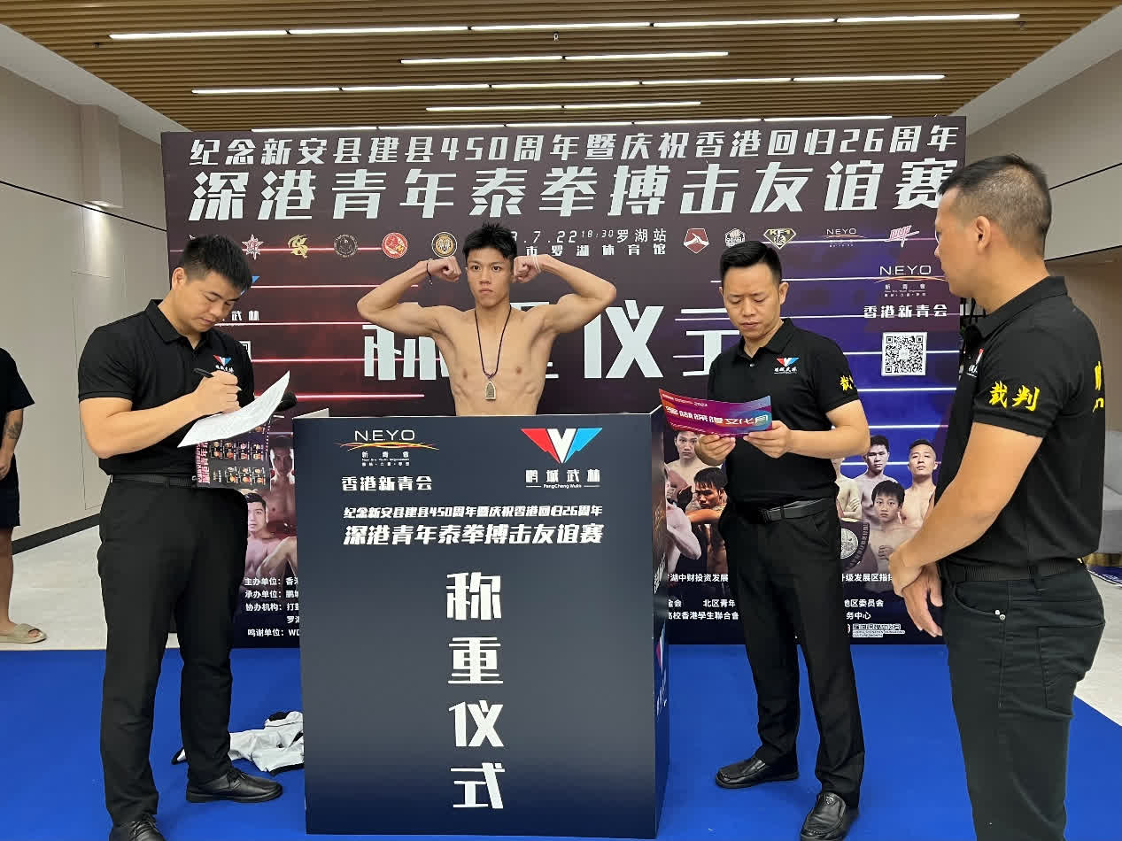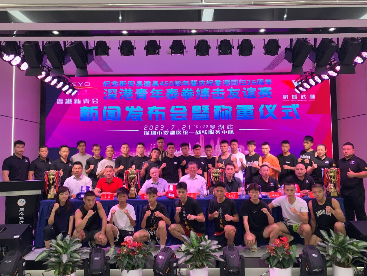由新青會主辦的紀念新安縣建縣450周年暨慶祝香港回歸26周年深港青年泰拳搏擊友誼賽羅湖站於7月21日舉行了新聞發布會暨稱重儀式。7月22日在深圳市羅湖體育館比賽正式開鑼並成功舉辦。本次比賽是中國泰拳搏擊界最高水平、最專業的賽事之一,規模史無前例,高手如林,如泰拳界頂尖選手香港泰拳女子金腰帶獲得者馮晉妍,東方戰龍冠軍16歲小將吳佳帆,香港I-1比賽2023年金腰帶得主夏宇等。共有來自深港兩地共14個隊伍28位運動員參賽,其中最小的13歲,最大的48歲,為大家呈現出一場精彩絕倫酣暢淋漓的專業比賽。賽場2000多名觀眾不分地區,不分你我共同為選手們加油打氣、現場氣氛熱烈。