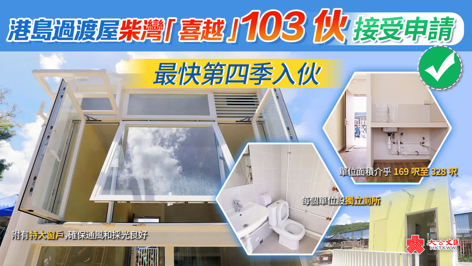 由社區組織協會興建和營運、獲特區政府撥款5,665萬元組裝合成興建的全港首個位於港島區過渡性房屋柴灣「喜越」,提供102個一至二人單位和一個無障礙單位,單位面積介乎169呎至328呎,基本租期最少3年,對象以基層劏房戶居民優先,其中80%名額會編配給輪候公屋滿3年的申請者,餘則為輪候未滿3年或有住屋需要者。