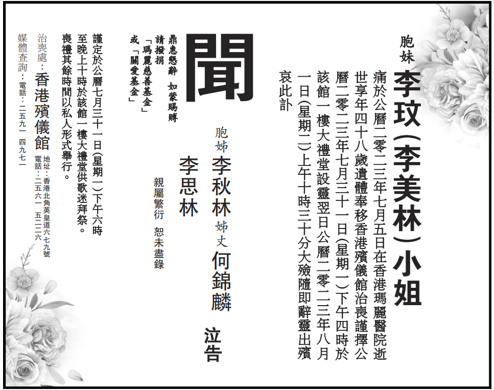 早前李思林為李玟刊登訃聞,寫道:李玟2023年7月5日於香港瑪麗醫院逝世、享年48歲,遺體將移送至香港殯儀館治喪,並於7月31日下午4時在殯儀館1樓大禮堂設靈,隔天(8月1日)上午10時30分出殯。另外,靈堂開放31日下午6時至晚間10時供歌迷前來拜祭,其餘時間則以私人形式舉行。雖然訃聞未見李玟丈夫Bruce名字,但有台灣媒體爆料指Bruce亦會現身喪禮。