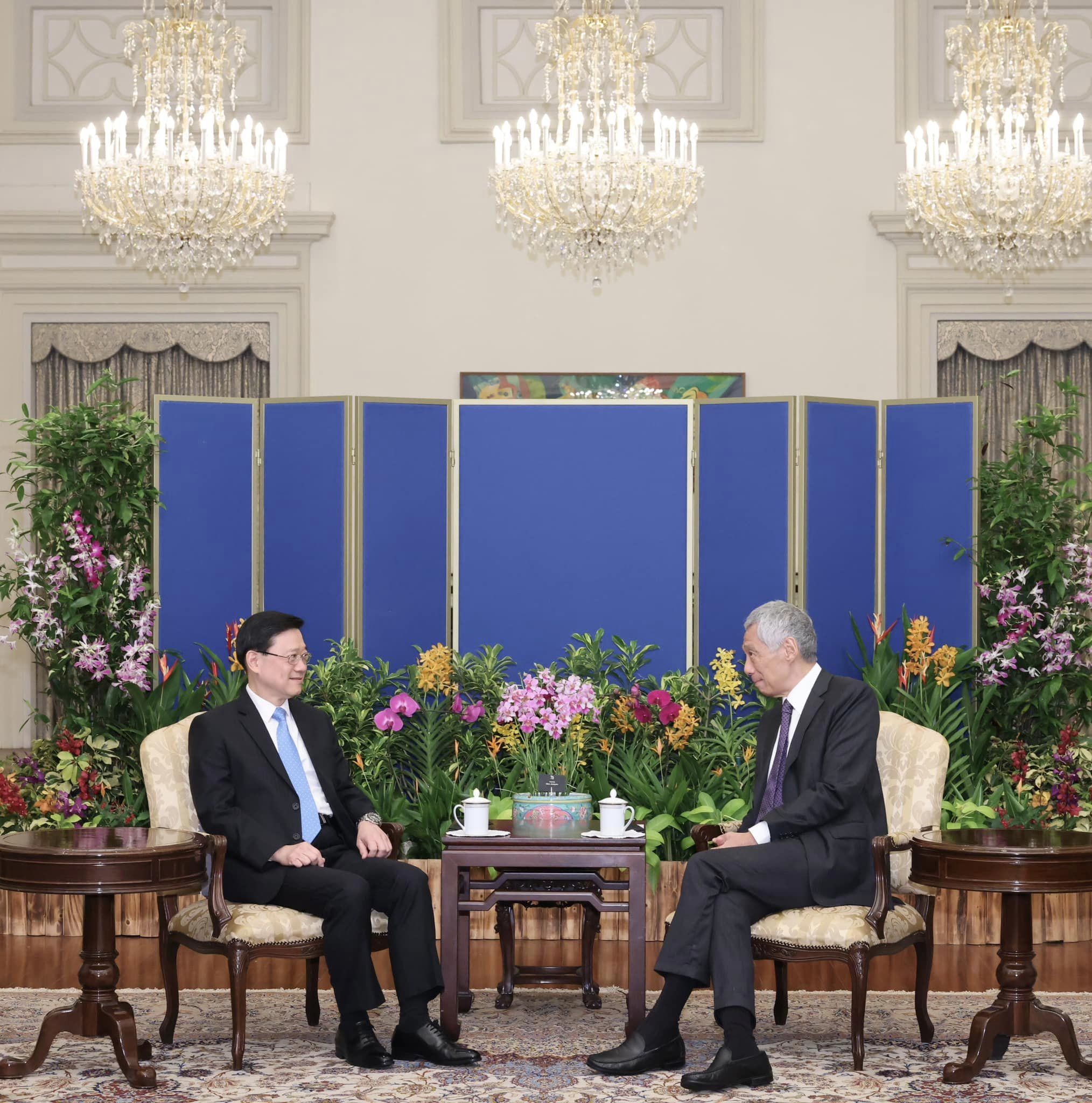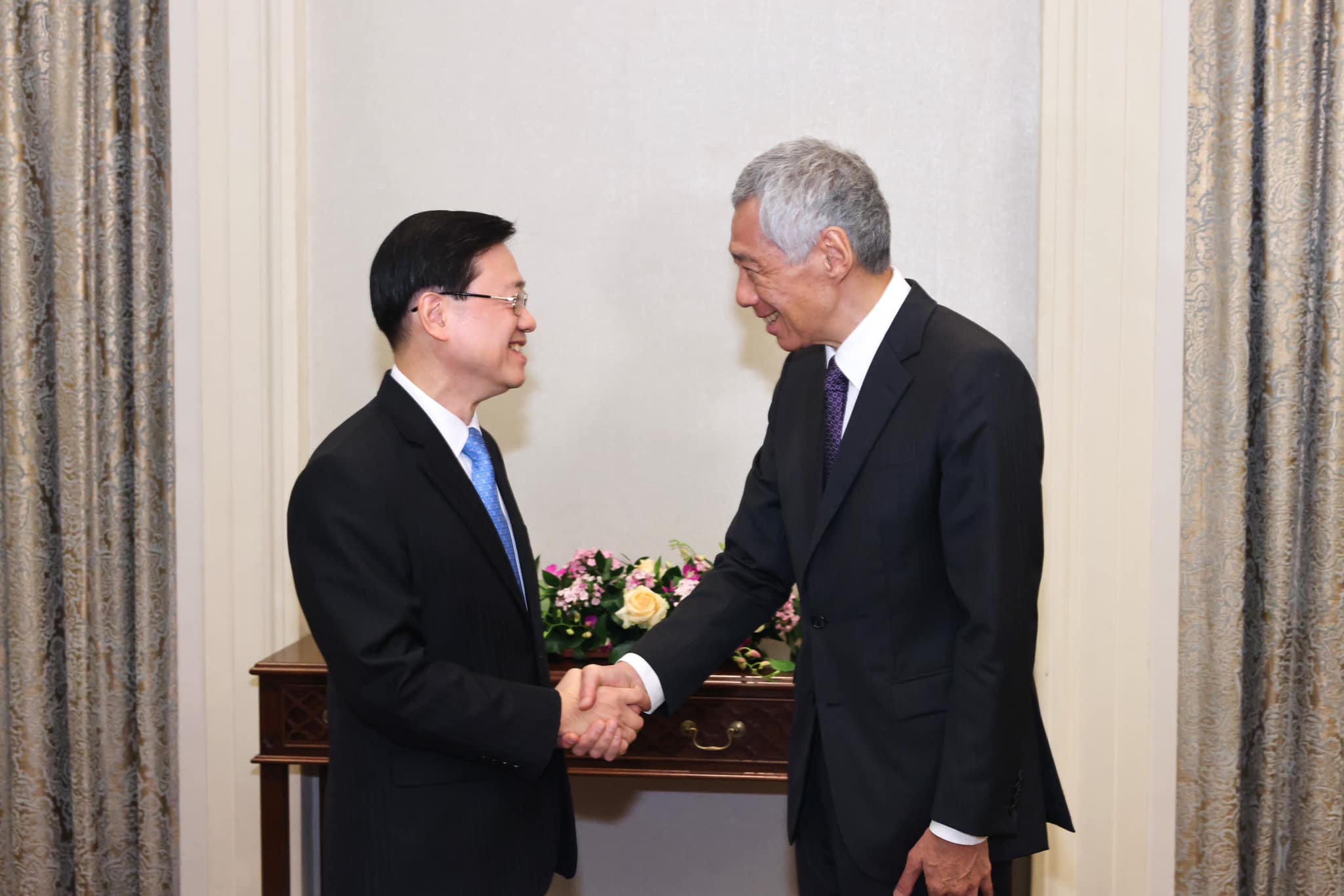 大公文匯全媒體報道,行政長官李家超今日(24日)繼續率團訪問東盟三國。他中午與新加坡總理李顯龍會面。兩人在會面前握手合照。