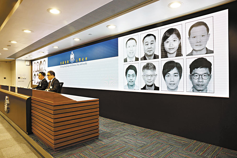 警方國安處本月3日宣布已向法庭申請拘捕令,以每人100萬港元懸紅通緝8名涉嫌干犯嚴重危害國家安全罪行、竄逃海外的逃犯,包括任建峰(前「法政匯思」召集人)、袁弓夷(海外所謂「香港議會」的發起人)、郭鳳儀(在美港人組織「香港民主委員會」執行總監)、郭榮鏗(立法會法律界前議員)、許智峯(民主黨立法會前議員)、蒙兆達(前「職工盟」總幹事)、劉祖廸(「港獨」組織「攬炒巴」頭目)、羅冠聰(前「香港眾志」秘書長、立法會前議員),全面追查與各人有聯繫的罪犯及切斷其資金鏈。