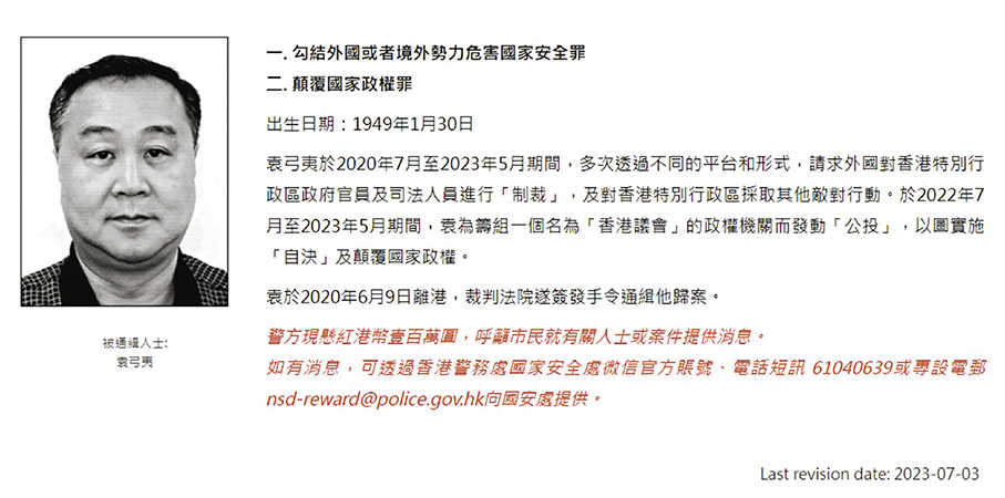 警方國安處本月3日以每人懸紅100萬港元,通緝8名干犯香港國安法竄逃海外的反中亂港分子,當中包括在海外籌組反華平台「香港議會」的袁弓夷,其意圖假借所謂的「公投」推翻中央和香港特區政府,以及請求外國政府制裁香港的法官等,因而涉嫌干犯香港國安法下的「顛覆國家政權罪」及「勾結外國或者境外勢力危害國家安全罪」。