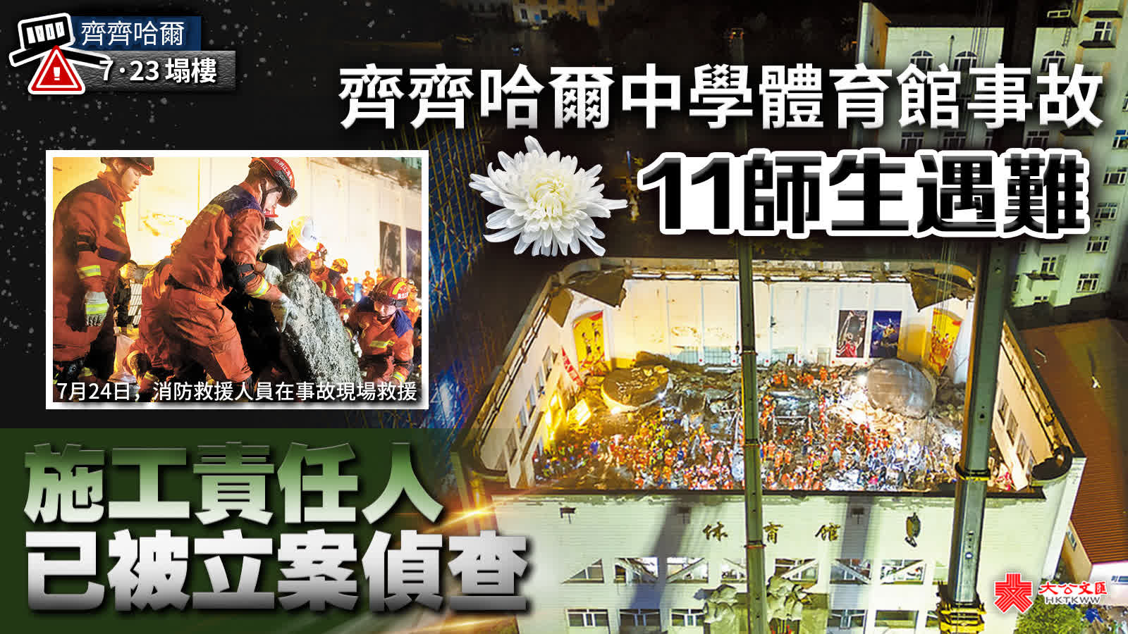 (香港文匯報記者 于海江)7月23日14時56分,黑龍江省齊齊哈爾市第三十四中學體育館發生屋頂坍塌。事發時,該校女排2名教練和17名隊員正在體育館內集訓。至24日上午,最後一名被困學生確認遇難,此次事故共造成11名師生死亡。經現場初步調查,與體育館毗鄰的教學綜合樓施工過程中,施工單位違規將珍珠岩堆置體育館屋頂。受降雨影響,珍珠岩浸水增重,導致屋頂荷載增大引發坍塌。