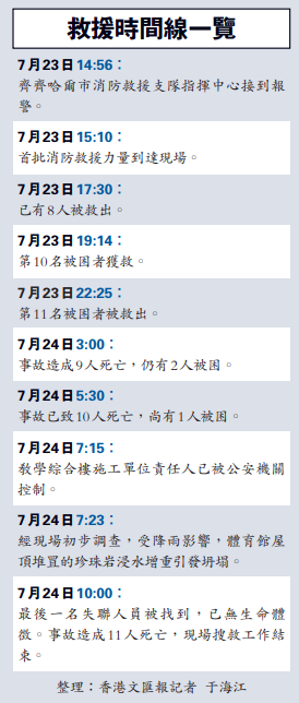 「事發當天齊齊哈爾一直在下雨,聽到轟隆一聲,沒想到樓就塌了。」目擊者劉先生告訴香港文匯報記者,當時以為是打雷。從事建築設計施工多年的張先生說,體育館旁曾經是一塊空地,學校在此種植了向日葵和玉米等。去年年底,這塊空地開始動工修建學校附屬綜合樓。