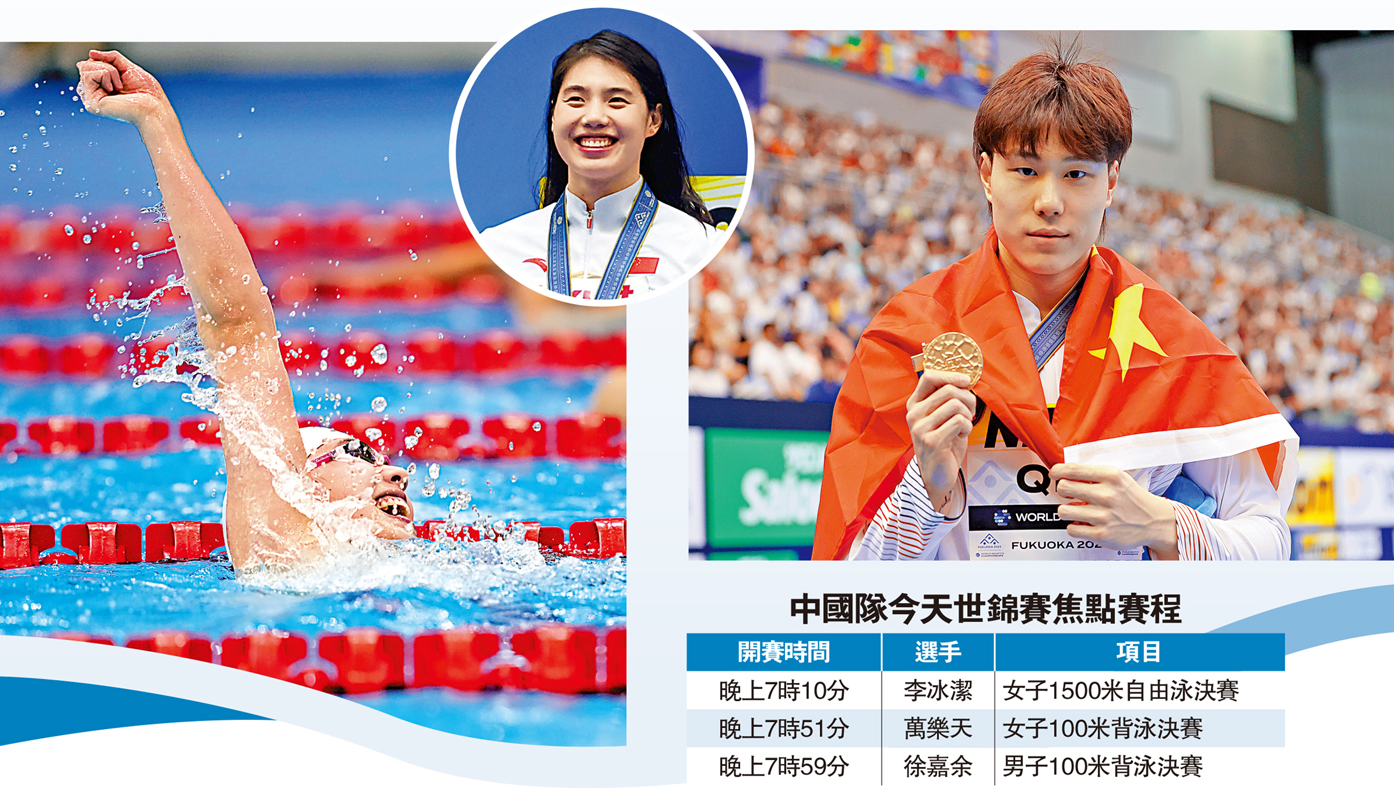 (大公報記者 梁潤森)中國游泳好手覃海洋昨晚在日本福岡舉行的世界游泳錦標賽男子100米蛙泳決賽,游出57秒69的佳績勇奪金牌,並繼初賽及準決賽後再次打破亞洲紀錄,更是中國男子蛙泳歷史上的首面世錦賽金牌。隊友張雨霏在女子100米蝶泳決賽以56秒12的成績封后。加上余依婷在女子200米混合泳獲銅,中國隊昨在獎牌榜進賬2金1銅。