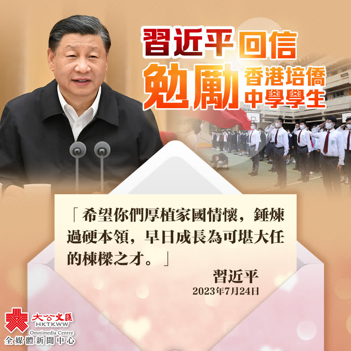 據新華社報道,國家主席習近平7月24日給香港培僑中學高一年級全體學生回信,對他們予以親切勉勵。