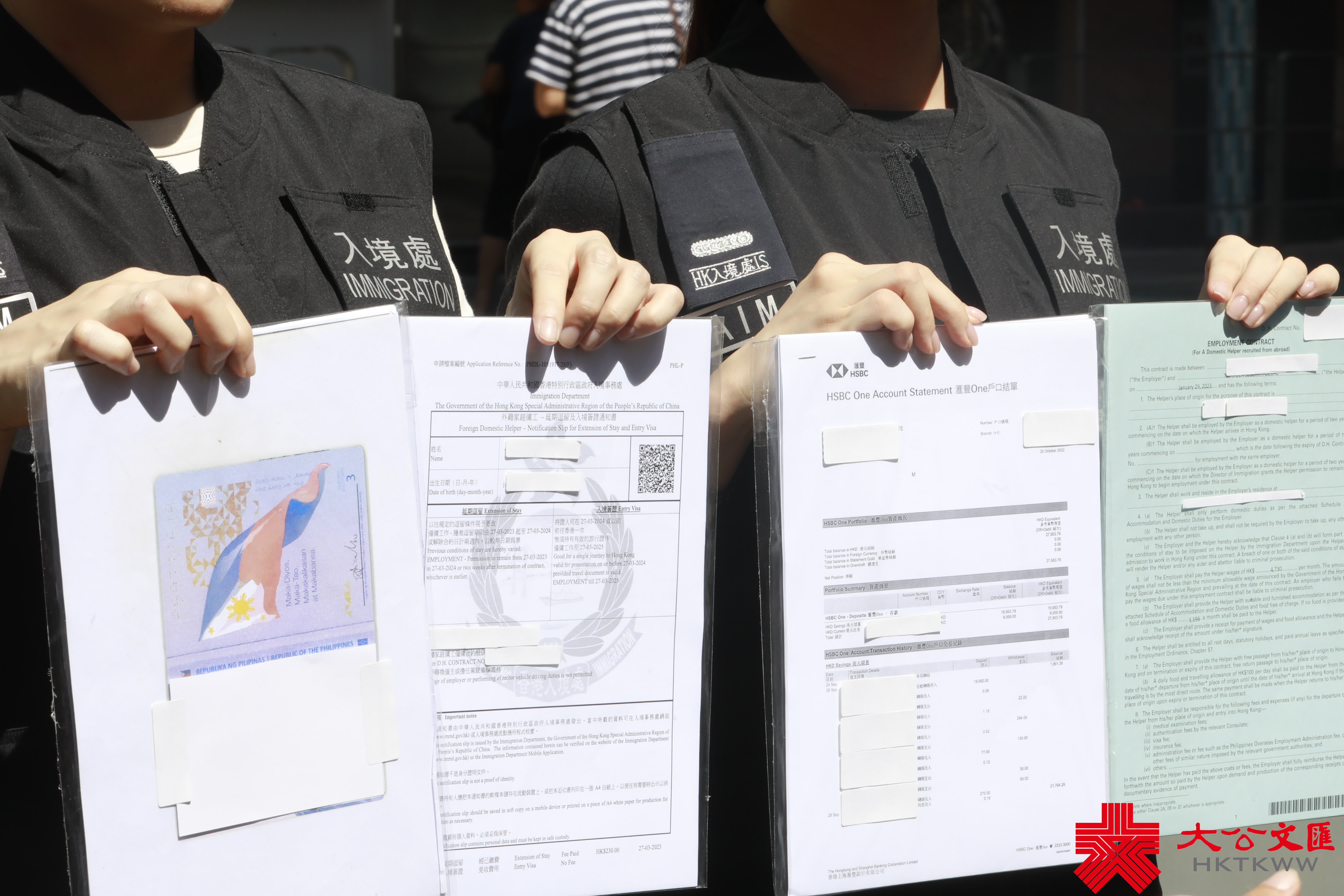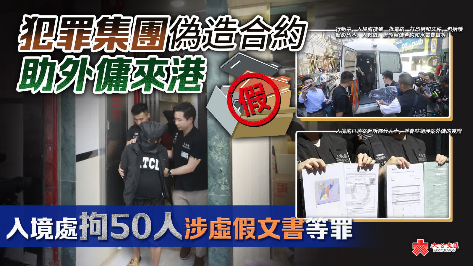 (大公文匯全媒體 記者 王俊傑)入境處部署近半年,今(25日)早成功搗破一個專門協助外傭以虛假僱傭合約申請留港的犯罪集團,拘捕約50人,當中涉案兩名菲律賓籍首腦,分別是六十餘歲香港居民和四十餘歲持擔保書人士。
