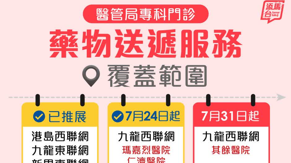 大公文匯全媒體報道,醫管局推出藥物送遞服務,為專科門診的到診病人提供多一個取藥方式,病人可透過局方的流動應用程式「HA Go」,選擇送藥到家中或指定地址。政府表示,醫管局已於港島西聯網、九龍東聯網、新界東聯網及港島東聯網(長洲醫院除外)推行藥物送遞服務,這兩星期更進一步分階段擴展至九龍西聯網的所有專科門診診所。