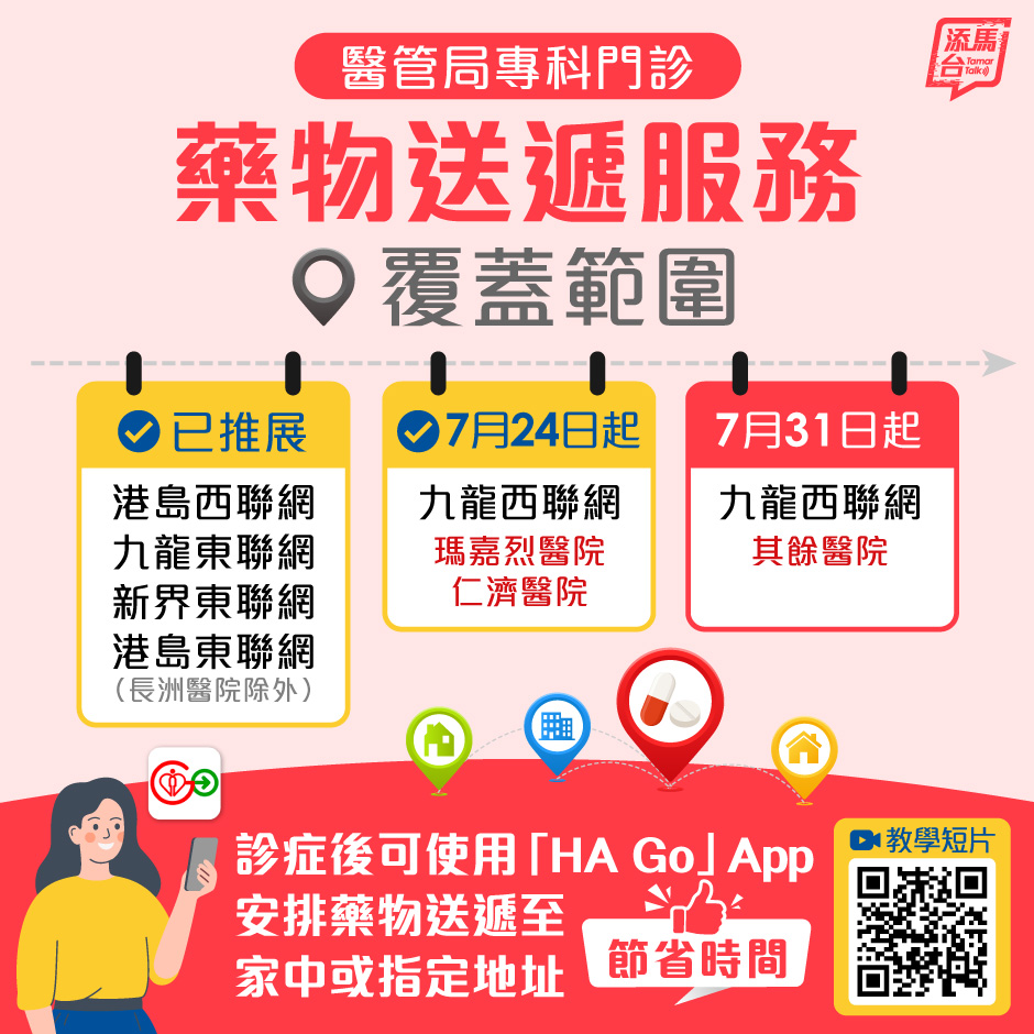 「藥物送遞服務」方便病人在診症後,通過「HA Go」應用程式安排藥物送遞到家中或指定地址,節省取藥時間。適用藥物包括醫管局轄下醫院和診所處方的大部分藥物(包括須冷藏藥物),不適用於新處方或急需藥物。費用為每張處方劃一65元。
