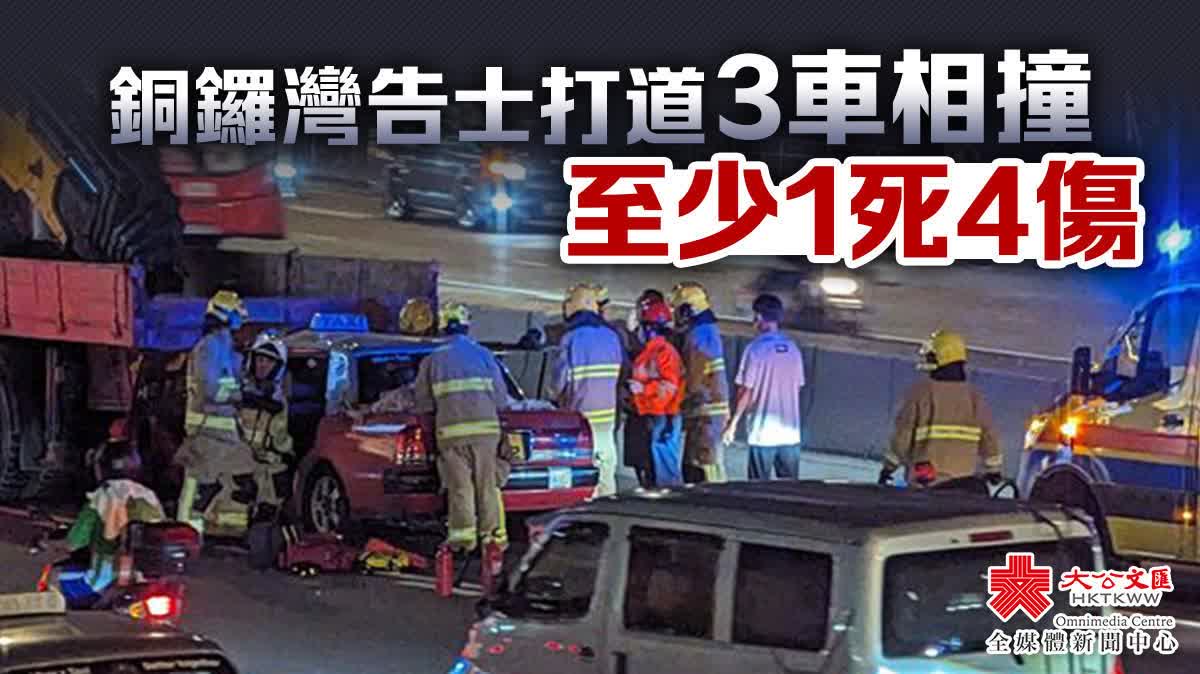 大公文匯全媒體報道,今日(25日)晚上8時許,銅鑼灣世貿中心對出的告士打道西行線,兩輛的士與一輛吊臂車相撞,其中一輛的士直插吊臂車車底,1人當場不治至少4人送院。