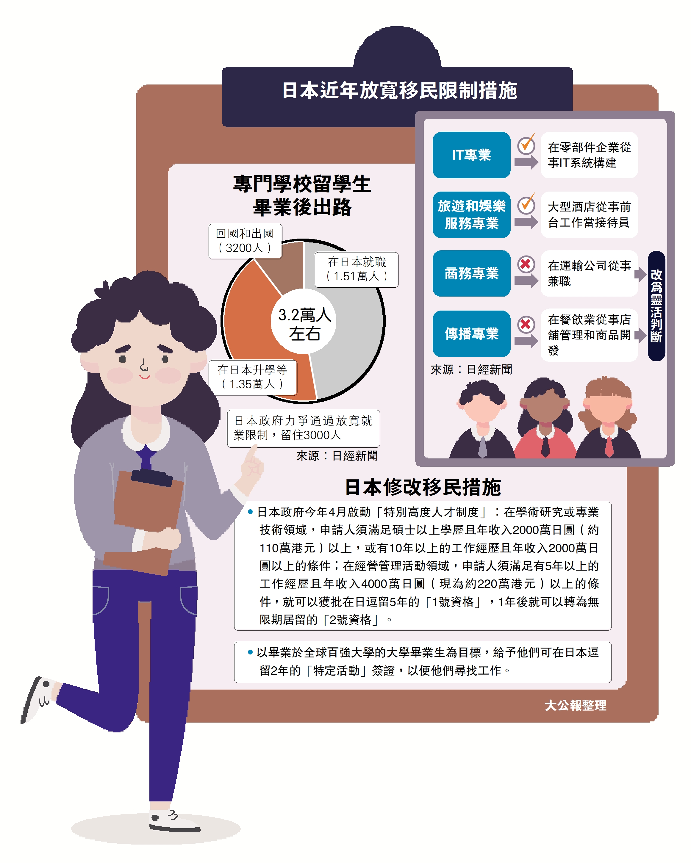 據日本《經濟新聞》報道,日本法務省最早將於今年秋季,正式宣布大幅擴大就讀於「專門學校」(即專科學校)的外國留學生的就業範圍。日本這種兩年制的專門學校屬於高等教育機構之一,主要提供專業培訓課程,涵蓋商務、餐飲、文化類(流行音樂、配音、動漫畫製作)、教育和農業等行業,入學門檻亦比大學容易,吸引不少年輕人報讀。