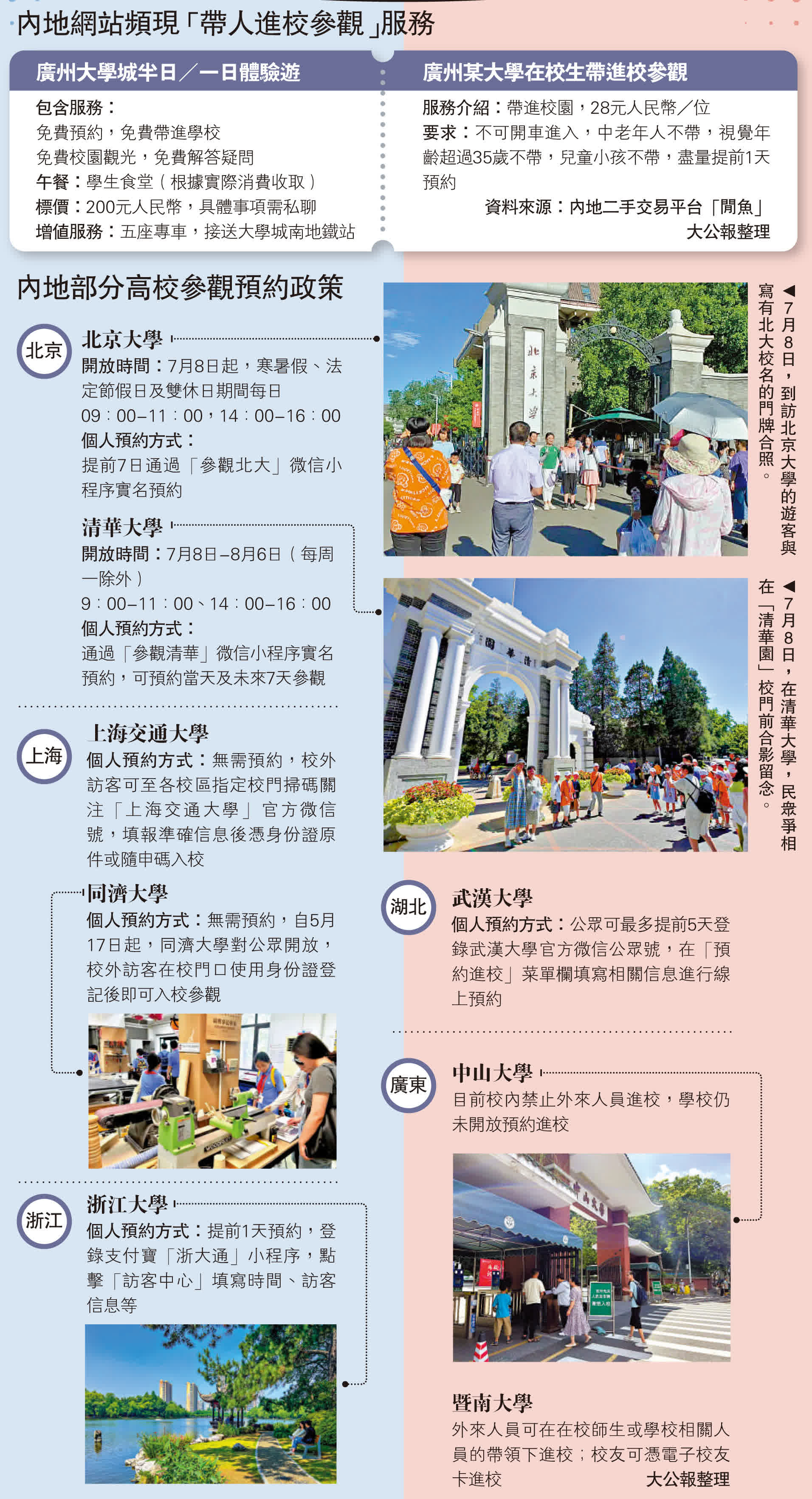 (大公報記者 江鑫嫻 實習記者 岑嘉怡)暑假以來,北京大學、清華大學等內地知名高校陸續開放校園予校外人士預約參觀。但隨着研學遊的火爆,通過官方預約渠道進入「清北」成為了「不可能的任務」,「黃牛」更做起高價代搶、「帶人進校」的生意,報價「一家三口遊清北2000元(人民幣,下同)」。還有北大校友先後拆分預約139人入校進行研學,每人收費10800元。當「參觀象牙塔」成為一門賺錢的生意,高校該不該設置「圍牆」,如何向公眾開放的話題再次引發熱議。大學到底是供所有社會成員共同使用的公共空間,還是為了保證師生學習生活秩序只能「有限」開放的秘密庭院?