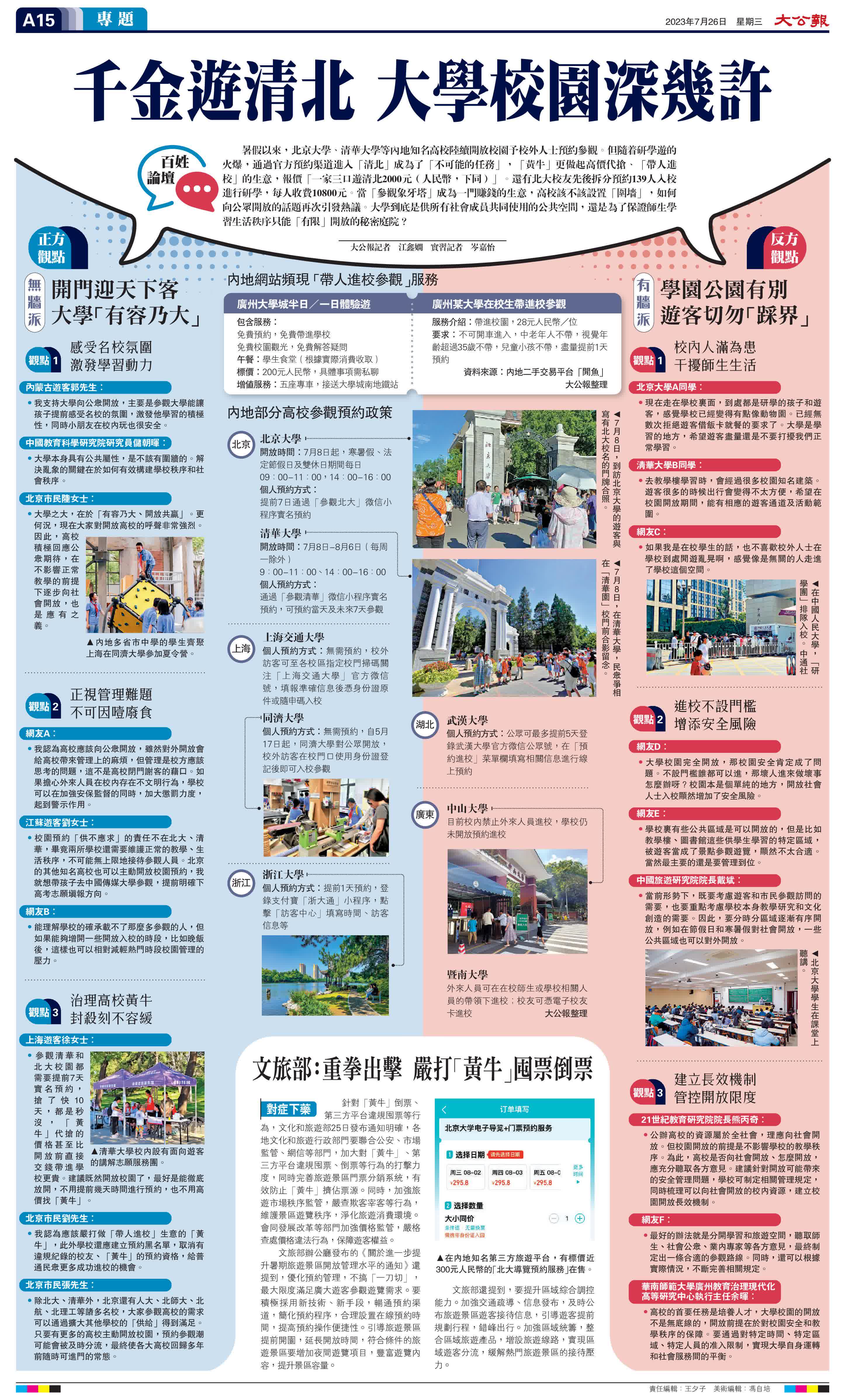•當前形勢下,既要考慮遊客和市民參觀訪問的需要,也要重點考慮學校本身教學研究和文化創造的需要。因此,要分時分區域逐漸有序開放,例如在節假日和寒暑假對社會開放,一些公共區域也可以對外開放。