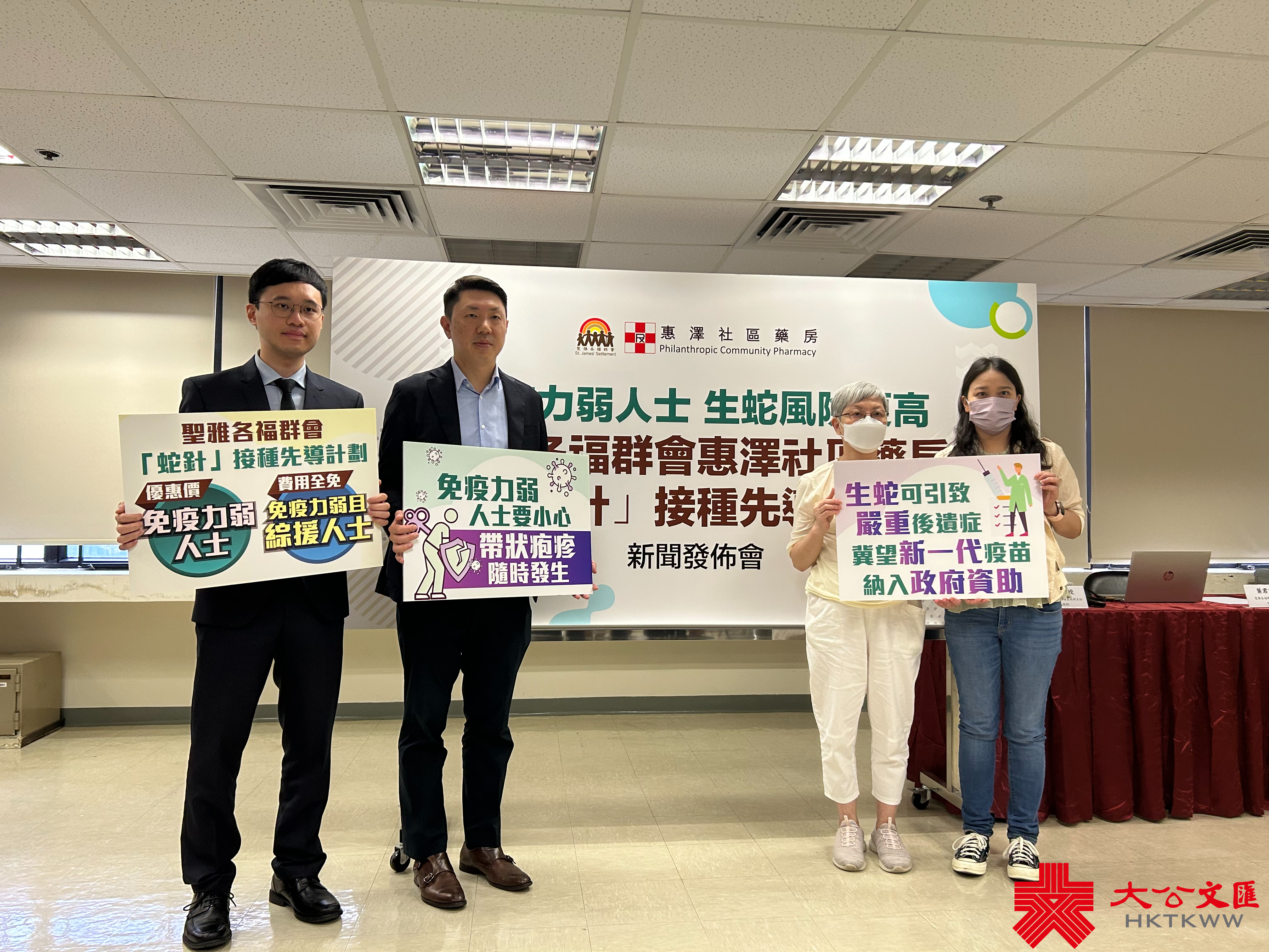 (大公文匯全媒體記者 嚴璐瑶)聖雅各福群會惠澤社區藥房推出「新一代重組帶狀疱疹疫苗(RZV)接種先導計劃」,為有經濟困難的合資格人士提供100個免費接種名額,以及讓其他合資格人士以優惠價格接種疫苗,幫助免疫力減弱人士及早減低患病風險。