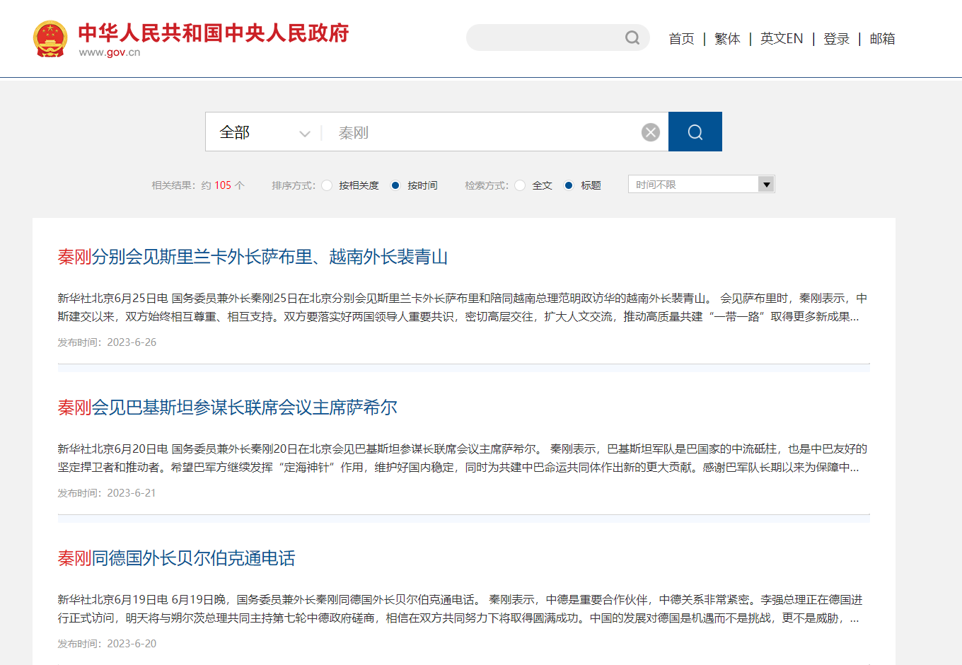 另外,記者在網站內搜索「秦剛」,仍顯示6月25日前秦剛相關政務活動的105條信息。