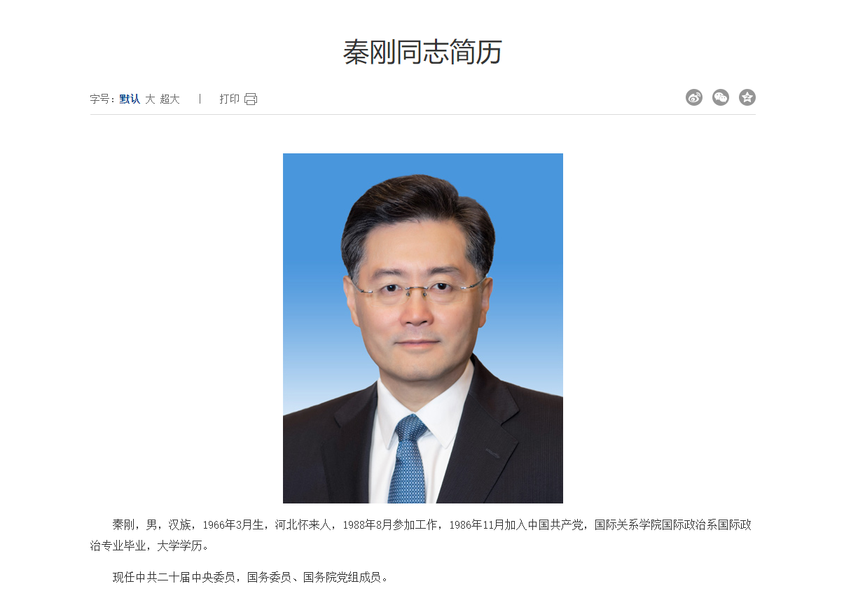網站亦更新了「秦剛同志簡歷」,現時顯示為:「秦剛,男,漢族,1966年3月生,河北懷來人,1988年8月參加工作,1986年11月加入中國共產黨,國際關係學院國際政治系國際政治專業畢業,大學學歷。現任中共二十屆中央委員,國務委員、國務院黨組成員。」