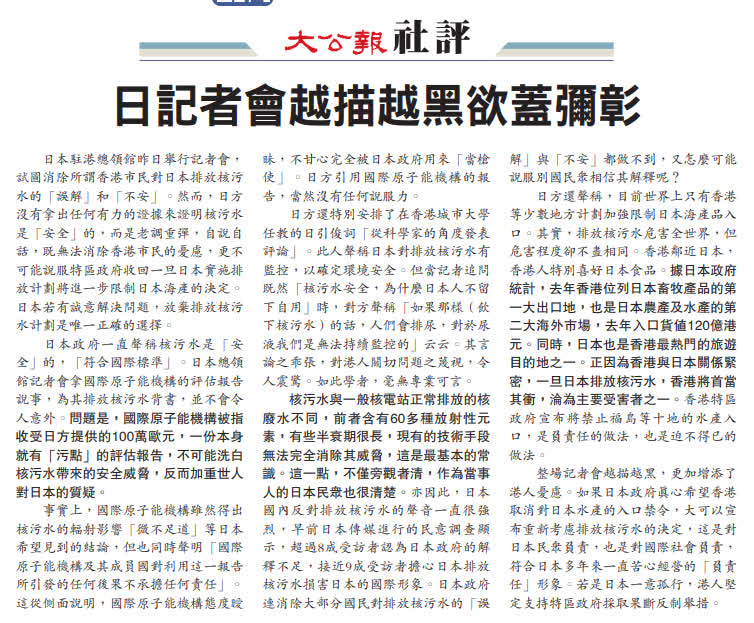 日本駐港總領館昨日舉行記者會,試圖消除所謂香港市民對日本排放核污水的「誤解」和「不安」。然而,日方沒有拿出任何有力的證據來證明核污水是「安全」的,而是老調重彈,自說自話,既無法消除香港市民的憂慮,更不可能說服特區政府收回一旦日本實施排放計劃將進一步限制日本海產的決定。日本若有誠意解決問題,放棄排放核污水計劃是唯一正確的選擇。