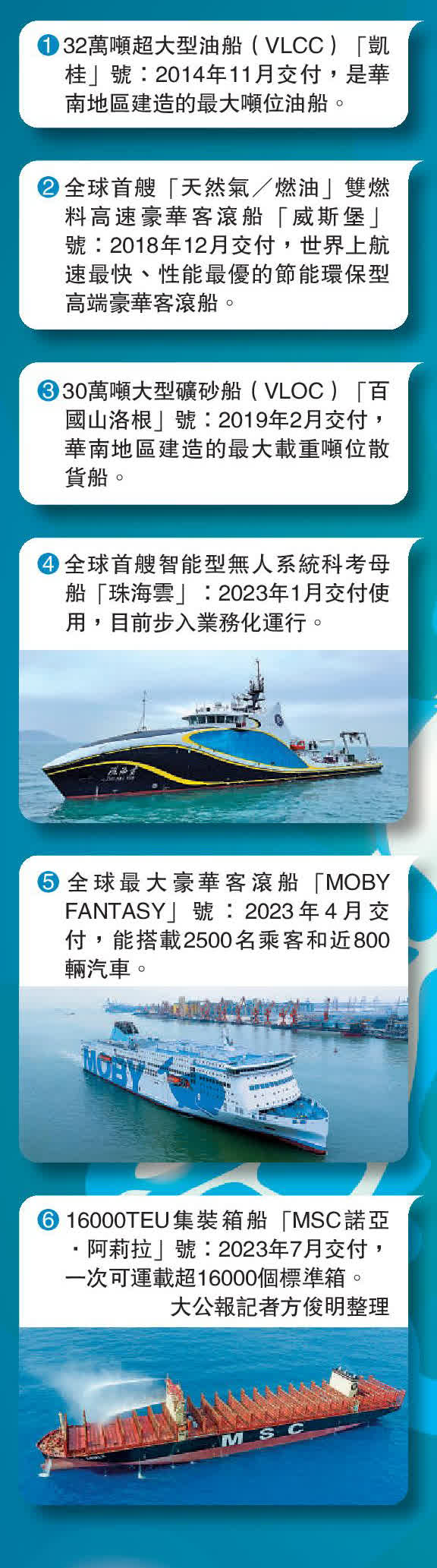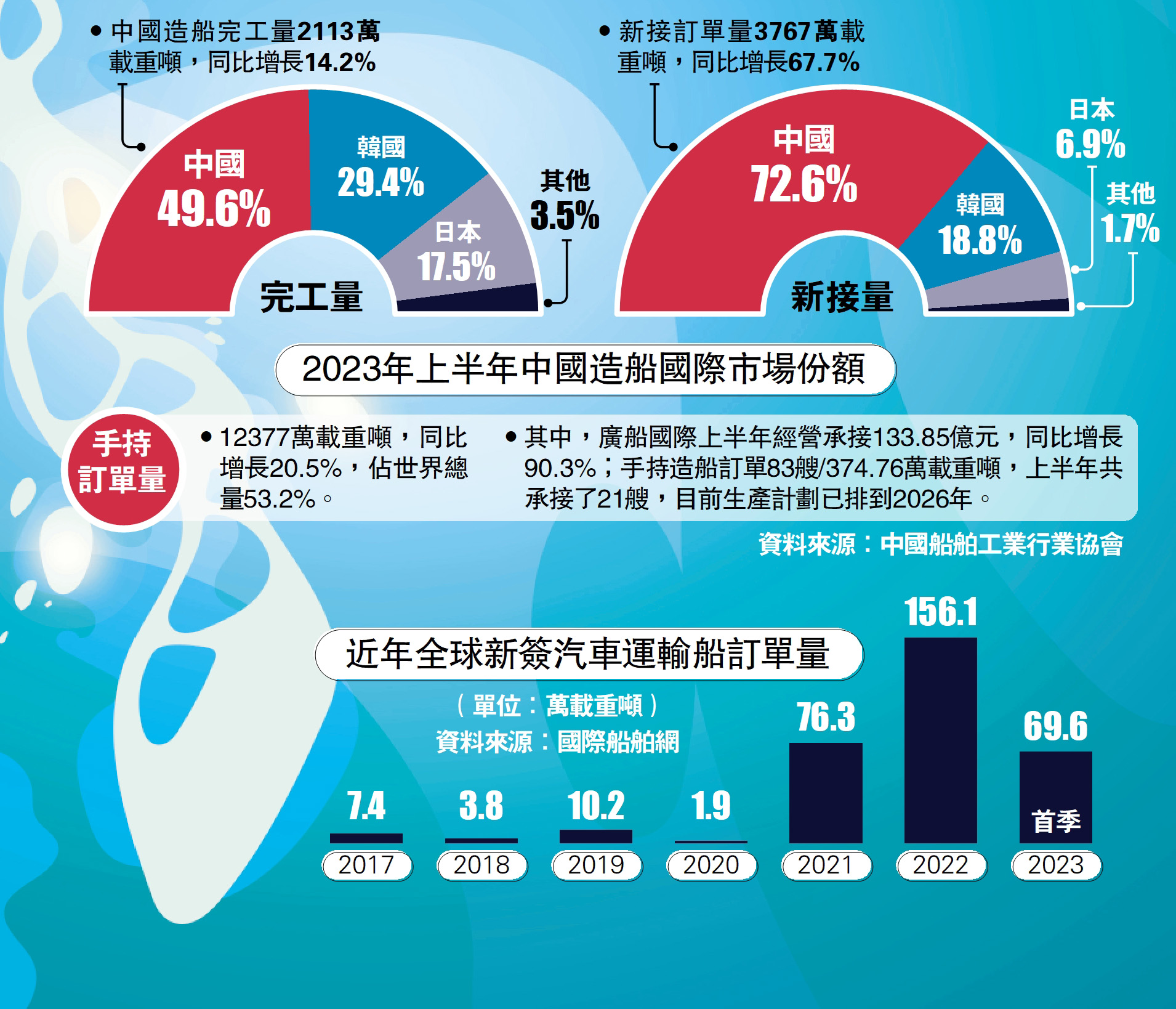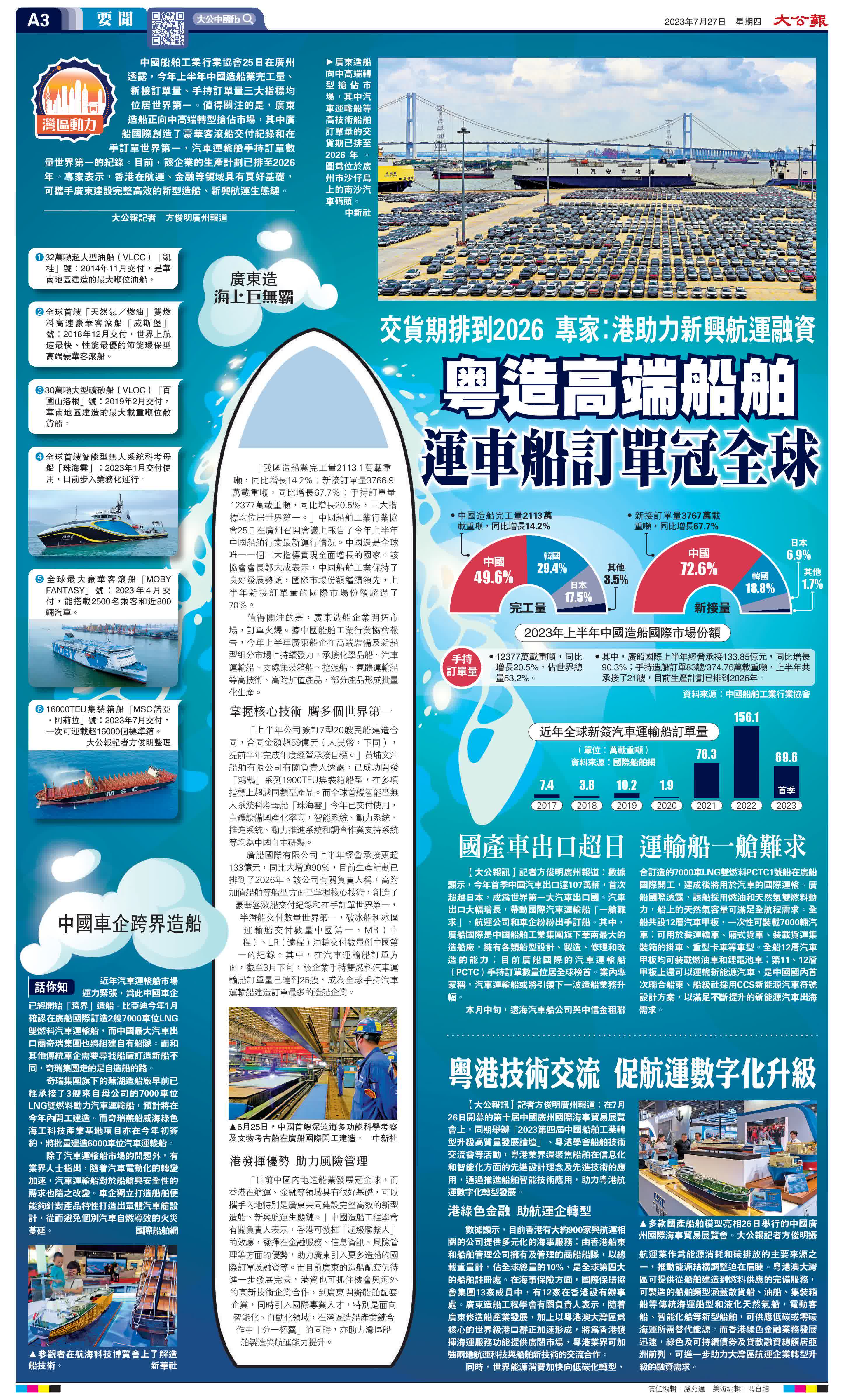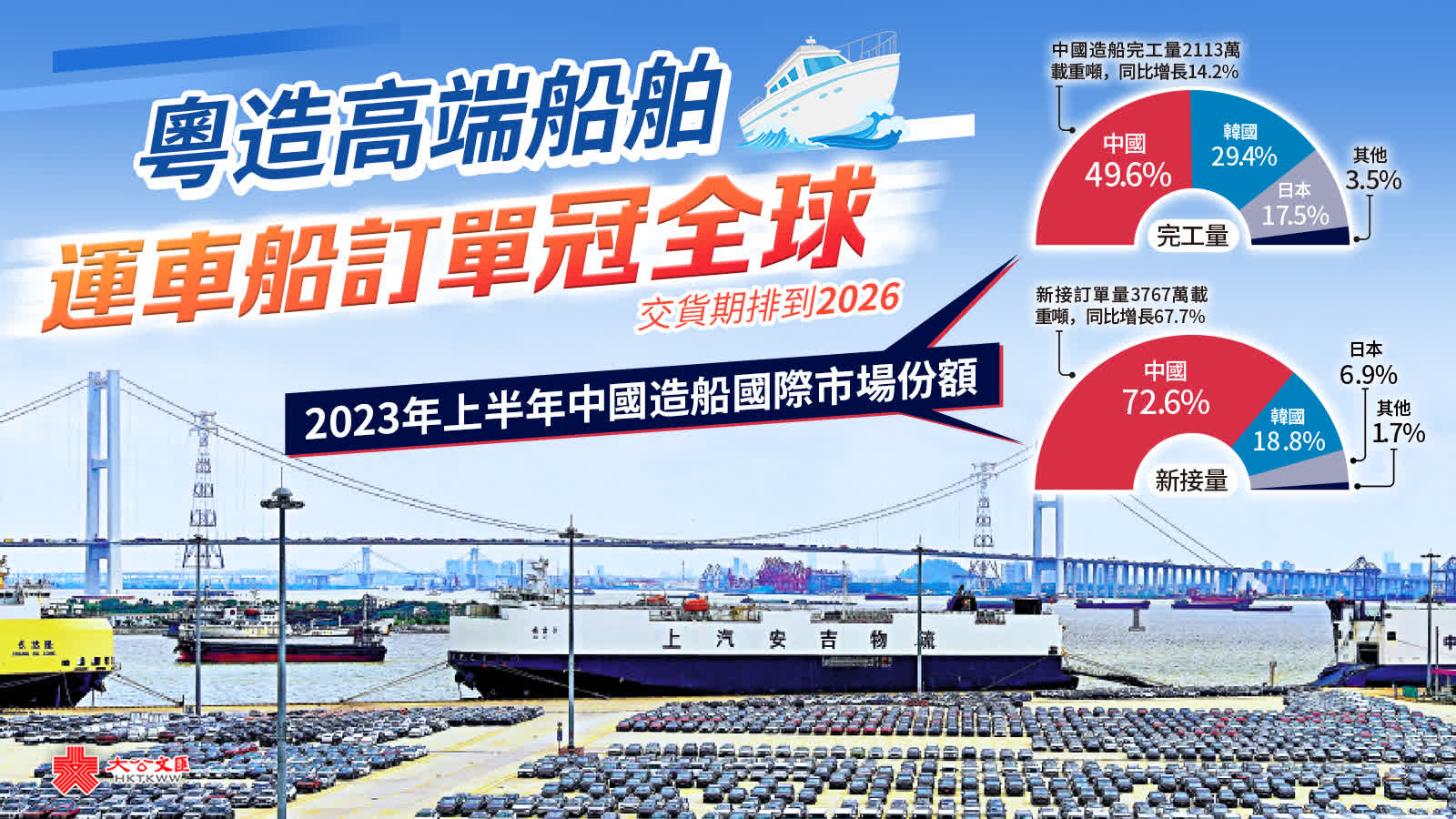 (大公報記者 方俊明)中國船舶工業行業協會25日在廣州透露,今年上半年中國造船業完工量、新接訂單量、手持訂單量三大指標均位居世界第一。值得關注的是,廣東造船正向中高端轉型搶佔市場,其中廣船國際創造了豪華客滾船交付紀錄和在手訂單世界第一,汽車運輸船手持訂單數量世界第一的紀錄。目前,該企業的生產計劃已排至2026年。專家表示,香港在航運、金融等領域具有良好基礎,可攜手廣東建設完整高效的新型造船、新興航運生態鏈。