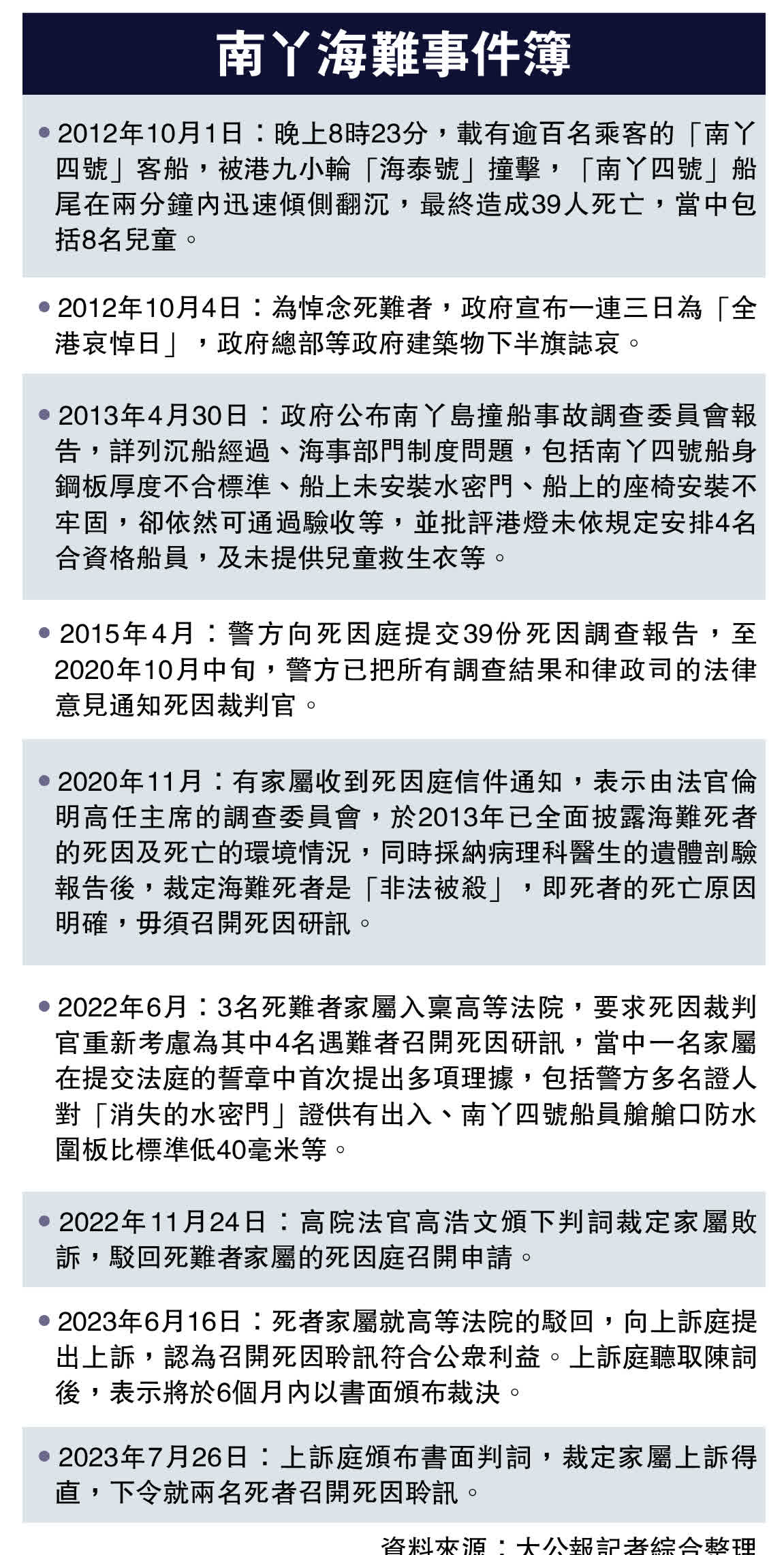 上訴庭昨日頒布書面判詞,裁定家屬上訴得直,下令就兩名死者召開死因聆訊。上訴庭認為,申請方所提出的問題,均是調查委員會報告沒有考慮或發表報告後才出現的事宜,當年的調查委員會報告未能全面涵蓋所有事實和問題,包括財利船廠是否一直知道艙壁需安裝水密門、「海泰號」在撞船時船頭是否以鋼片加固、「南丫四號」的艙口防水欄板高度是否低於規定水平、海員長時間工作及輪班安排等。