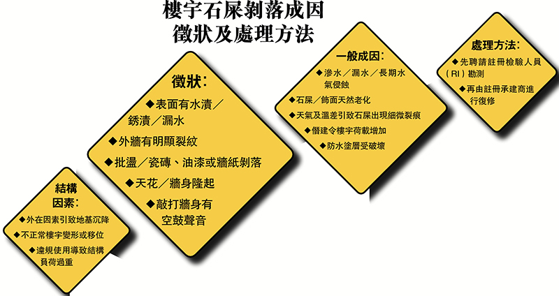 謝偉正解釋,石屎的表面屬混凝土保護層,可避免鋼筋受侵蝕,但如長期出現滲水、天氣及溫差引致細微裂痕,僭建或改裝令樓宇荷載增加,甚至出現外在因素引致地基沉降或不正常樓宇變形等結構性因素,石屎便會因承受不到自身重量而掉下來,「即使未必有即時危險,但已是一個警號。」